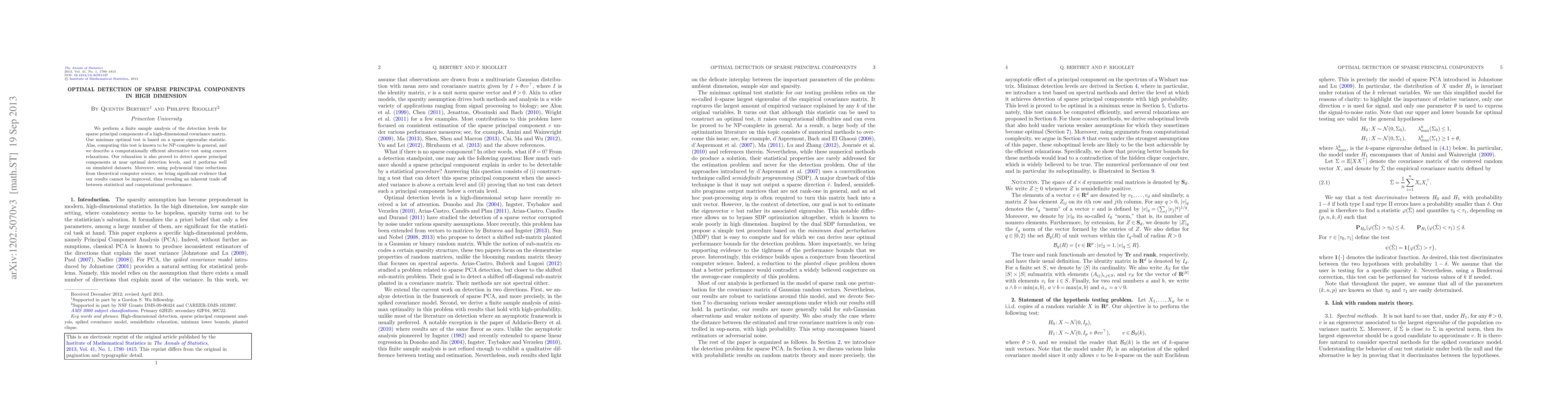 This paper develops a minimax optimal test for detecting sparse principal components in high-dimensional covariance matrices, addressing the NP-complete computational challenge through a computationally efficient convex relaxation. The proposed method maintains near optimal detection levels and demonstrates strong performance on simulated data.
