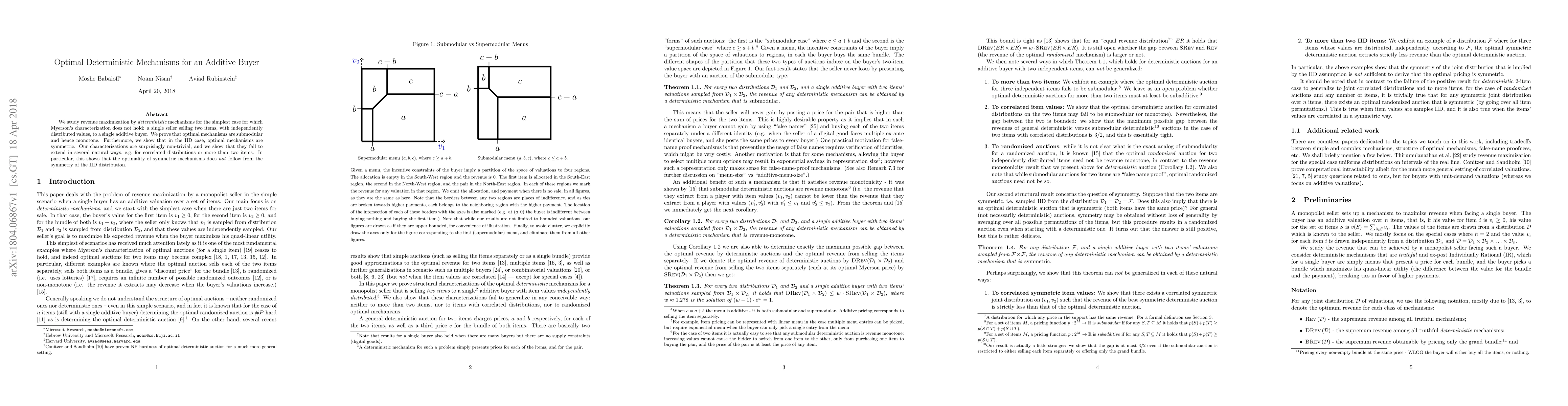 We study revenue maximization by deterministic mechanisms for the simplest case for which Myerson's characterization does not hold: a single seller selling two items, with independently distributed values, to a single additive buyer. We prove that optimal mechanisms are submodular and hence monotone. Furthermore, we show that in the IID case, optimal mechanisms are symmetric. Our characterizations are surprisingly non-trivial, and we show that they fail to extend in several natural ways, e.g. for correlated distributions or more than two items. In particular, this shows that the optimality of symmetric mechanisms does not follow from the symmetry of the IID distribution.