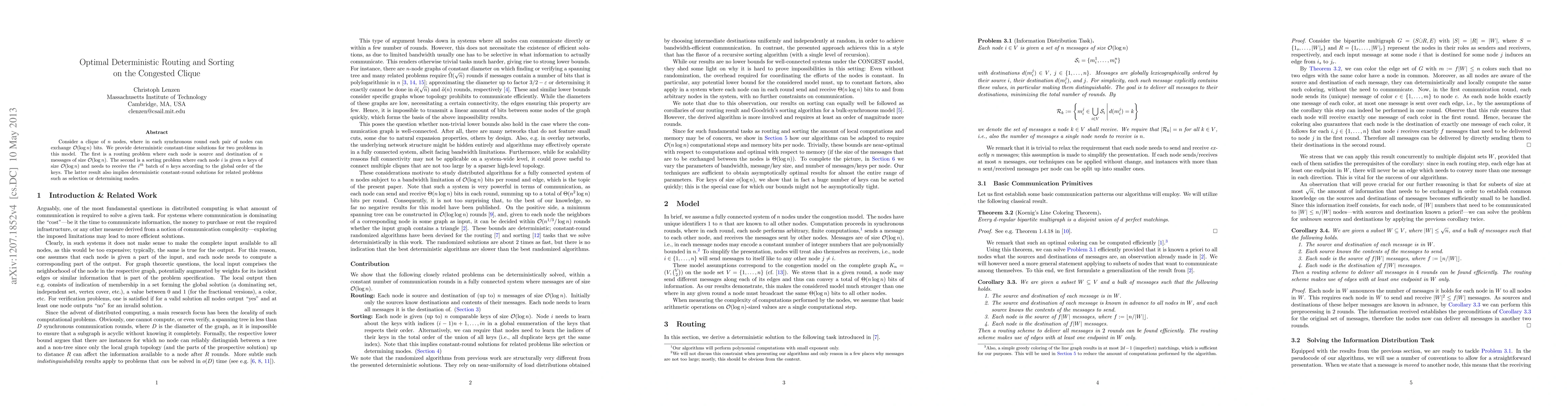 Researchers developed constant-time solutions for routing and sorting problems on a clique of n nodes with O(log n) bit exchanges per round, enabling efficient communication in congested environments.