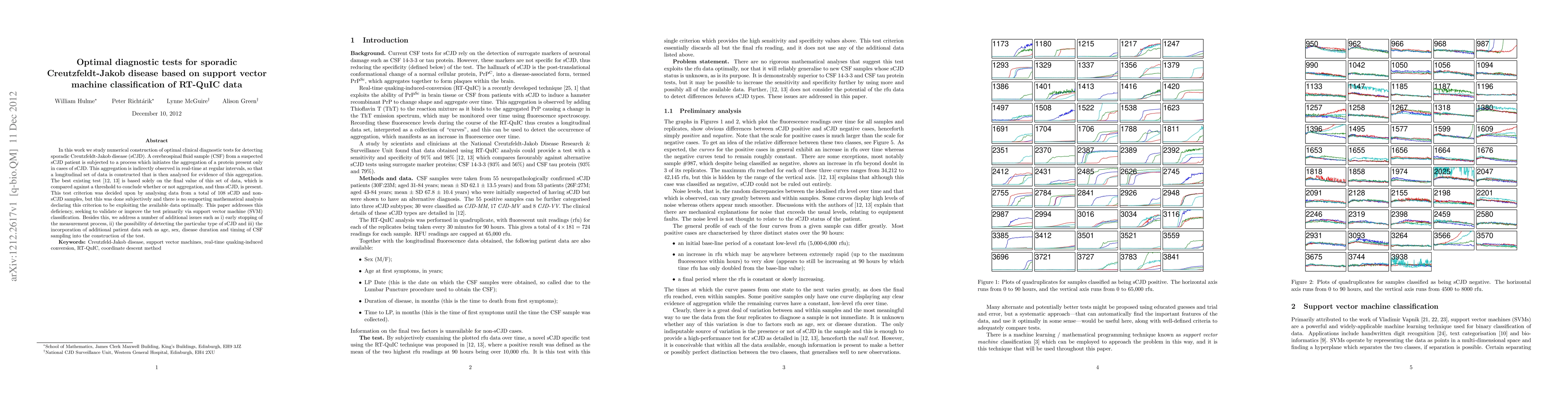 In this work we study numerical construction of optimal clinical diagnostic tests for detecting sporadic Creutzfeldt-Jakob disease (sCJD). A cerebrospinal fluid sample (CSF) from a suspected sCJD patient is subjected to a process which initiates the aggregation of a protein present only in cases of sCJD. This aggregation is indirectly observed in real-time at regular intervals, so that a longitudinal set of data is constructed that is then analysed for evidence of this aggregation. The best existing test is based solely on the final value of this set of data, which is compared against a threshold to conclude whether or not aggregation, and thus sCJD, is present. This test criterion was decided upon by analysing data from a total of 108 sCJD and non-sCJD samples, but this was done subjectively and there is no supporting mathematical analysis declaring this criterion to be exploiting the available data optimally. This paper addresses this deficiency, seeking to validate or improve the test primarily via support vector machine (SVM) classification. Besides this, we address a number of additional issues such as i) early stopping of the measurement process, ii) the possibility of detecting the particular type of sCJD and iii) the incorporation of additional patient data such as age, sex, disease duration and timing of CSF sampling into the construction of the test.
