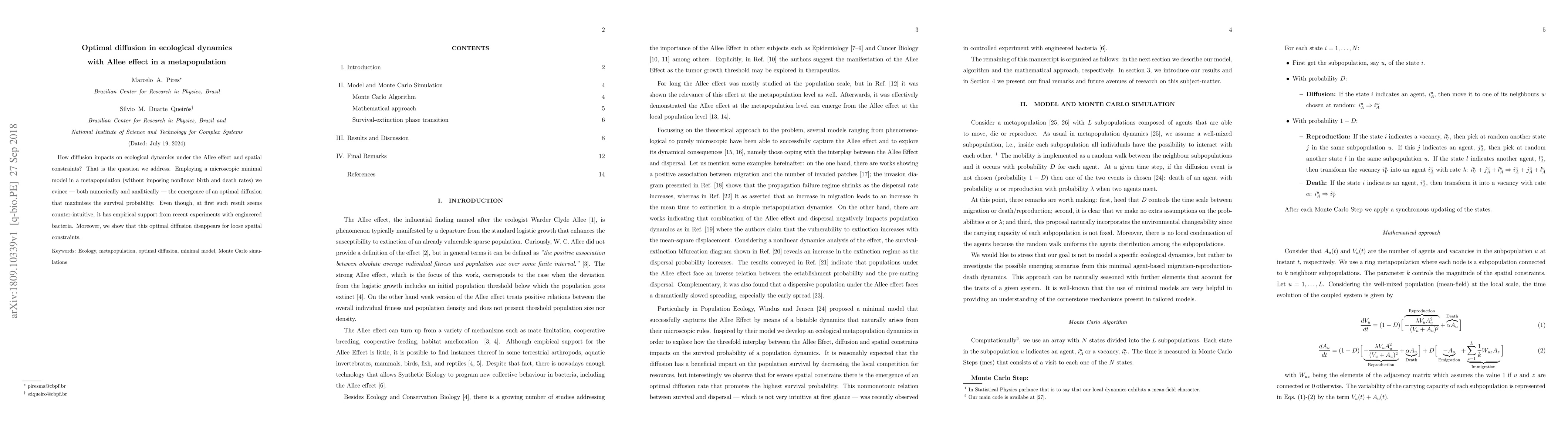 Researchers found that optimal diffusion can increase survival probability in metapopulations with Allee effects, contradicting intuition, and this effect disappears under loose spatial constraints.