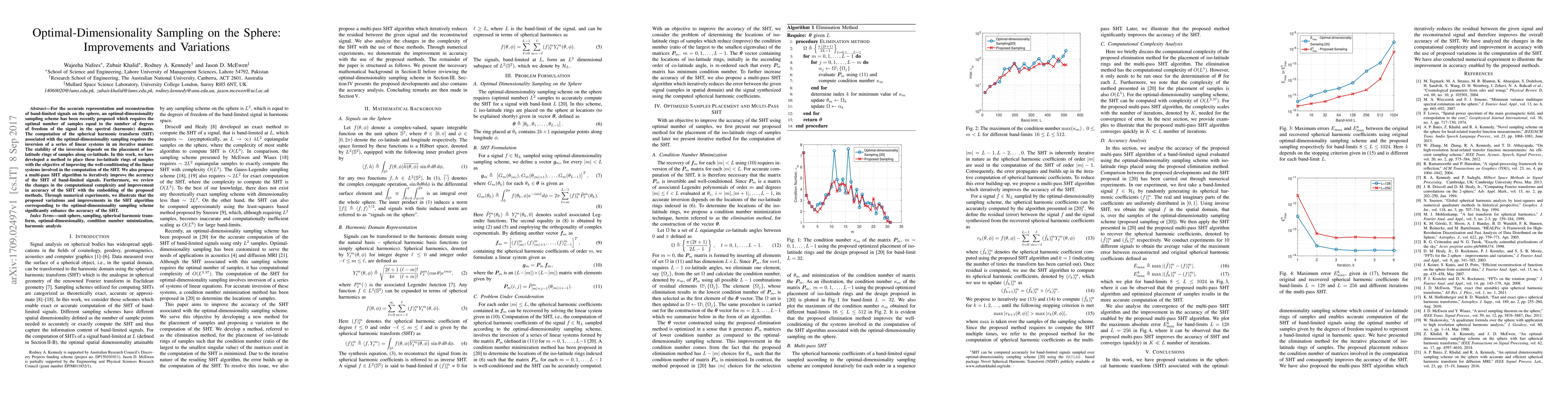 This paper proposes methods to improve the optimal-dimensionality sampling scheme for band-limited signals on the sphere, focusing on better placement of samples to enhance the well-conditioning of linear systems. It also introduces a multi-pass algorithm for iterative accuracy improvements, demonstrating significant enhancements in accuracy through numerical experiments.