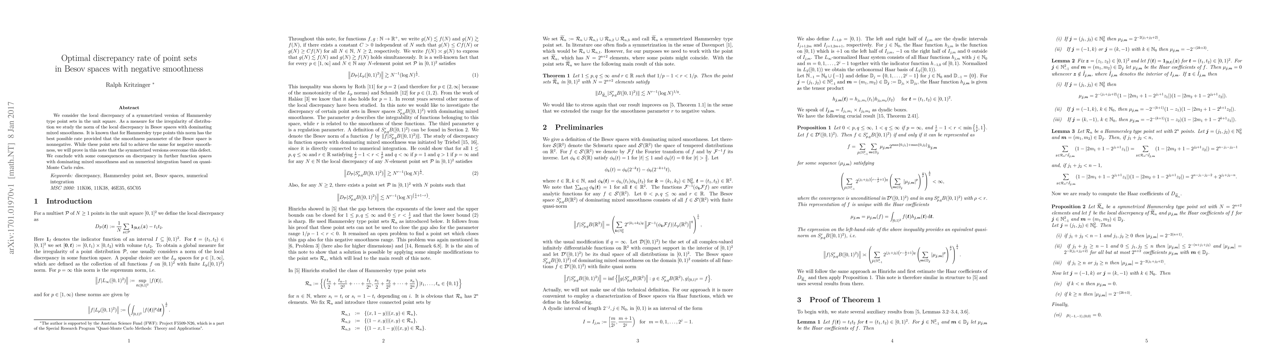 This research investigates the optimal discrepancy rate of symmetrized Hammersley point sets in Besov spaces with negative smoothness, proving that these symmetrized versions achieve the best possible rate previously unattainable for negative smoothness, with implications for function spaces and quasi-Monte Carlo integration.