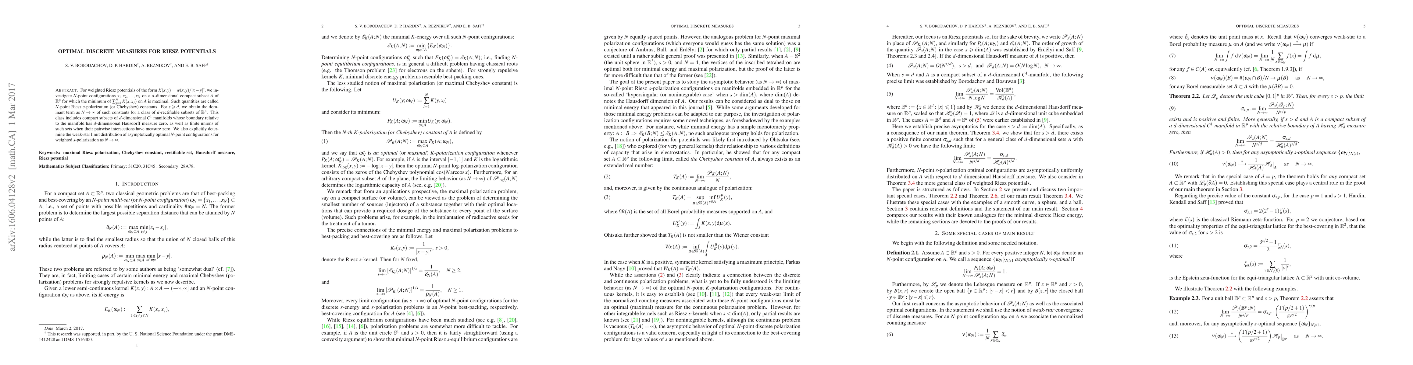 Researchers found optimal discrete measures for Riesz potentials on certain classes of compact subsets in high-dimensional space, including manifolds with zero boundary measure.