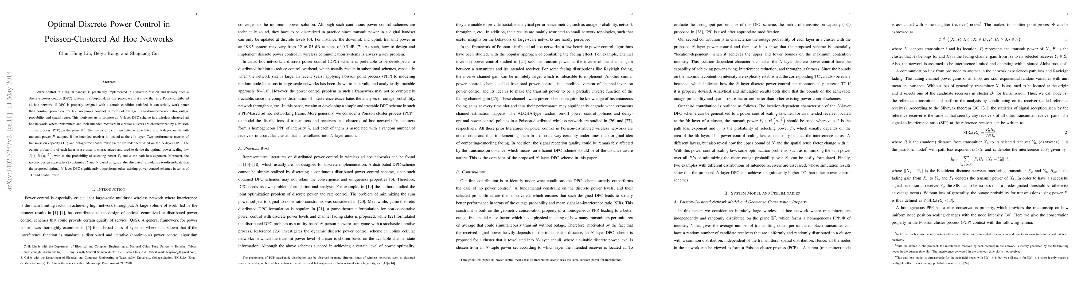 This research proposes an optimal N-layer discrete power control (DPC) scheme for wireless clustered ad hoc networks, demonstrating it outperforms existing schemes in terms of transmission capacity and spatial reuse. The methodology involves dividing clusters into N-layer annuli, each with specific transmit power, and deriving an optimal power scaling law. Simulation results validate the scheme's superior performance.