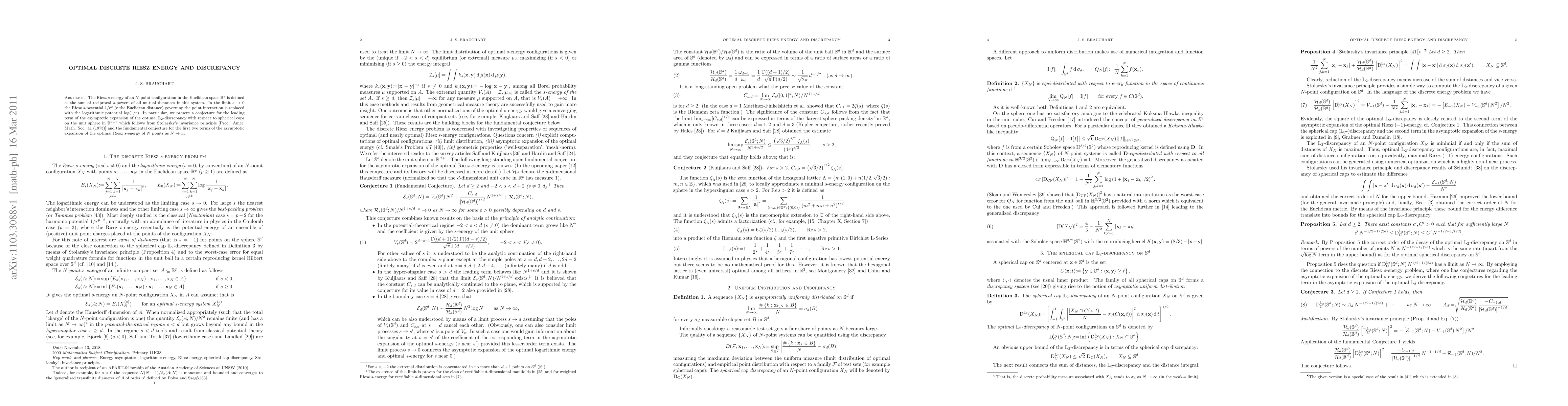 The Riesz $s$-energy of an $N$-point configuration in the Euclidean space $\mathbb{R}^{p}$ is defined as the sum of reciprocal $s$-powers of all mutual distances in this system. In the limit $s\to0$ the Riesz $s$-potential $1/r^s$ ($r$ the Euclidean distance) governing the point interaction is replaced with the logarithmic potential $\log(1/r)$. In particular, we present a conjecture for the leading term of the asymptotic expansion of the optimal $\IL_2$-discrepancy with respect to spherical caps on the unit sphere in $\mathbb{R}^{d+1}$ which follows from Stolarsky's invariance principle [Proc. Amer. Math. Soc. 41 (1973)] and the fundamental conjecture for the first two terms of the asymptotic expansion of the optimal Riesz $s$-energy of $N$ points as $N \to \infty$.