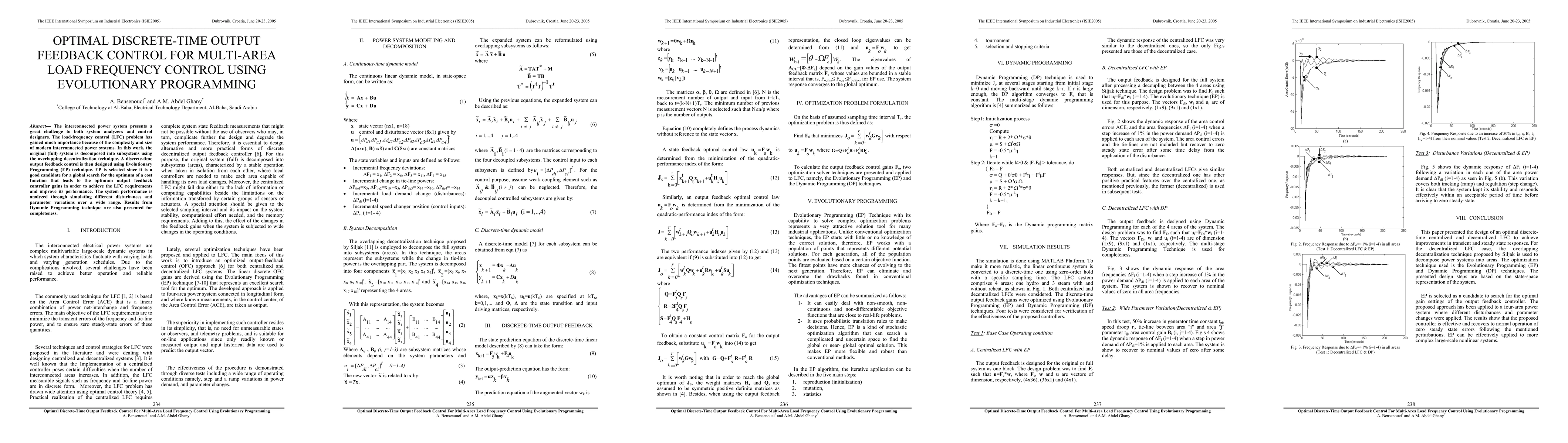 This paper proposes a discrete-time output feedback control strategy for multi-area load frequency control in interconnected power systems using Evolutionary Programming. The method decomposes the full system into subsystems and optimizes controller gains to enhance performance under various disturbances and parameter variations.