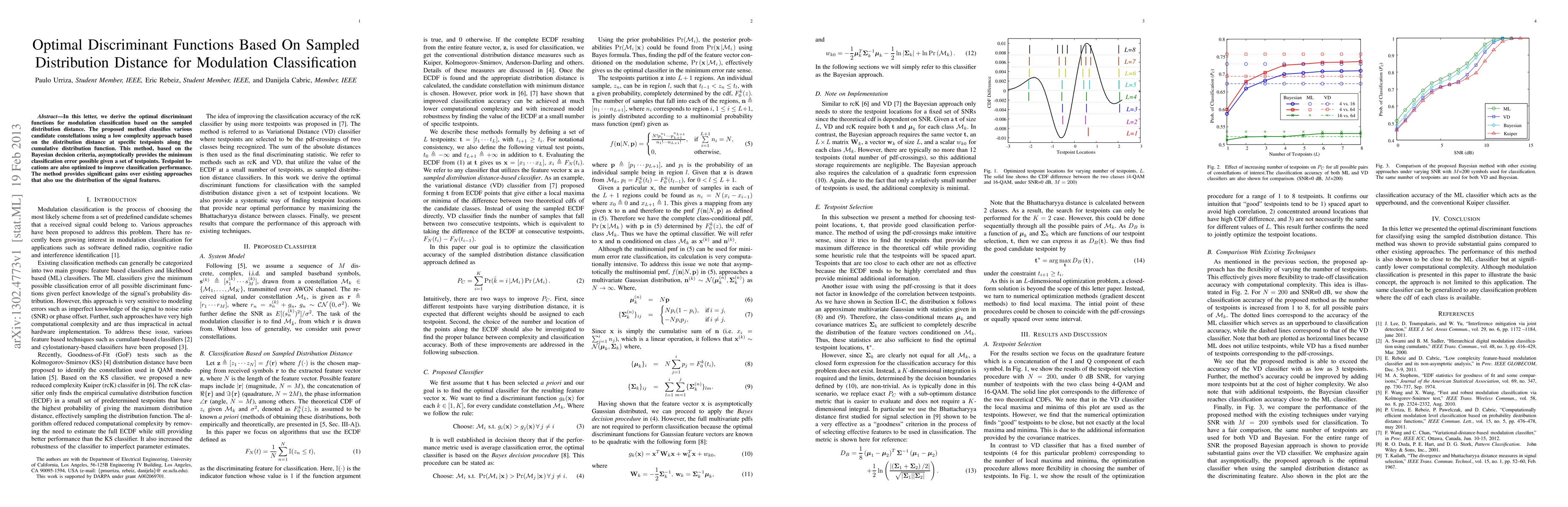 This paper proposes optimal discriminant functions for modulation classification using sampled distribution distance, achieving minimal classification error through a low complexity approach based on Bayesian decision criteria and optimized testpoints. The method outperforms existing techniques by leveraging distribution distance at specific testpoints along the cumulative distribution function.
