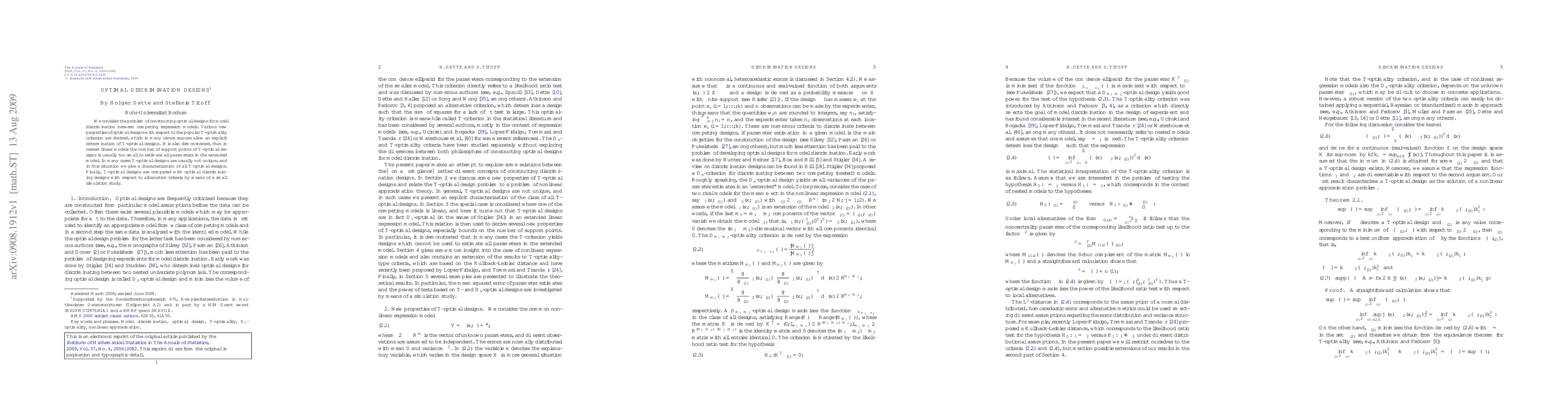 This paper explores optimal designs for discriminating between competing regression models, deriving new properties for $T$-optimality and showing that $T$-optimal designs often lack uniqueness and sufficient support points for parameter estimation in nested models. A simulation study compares $T$-optimal designs with designs optimized for alternative criteria.