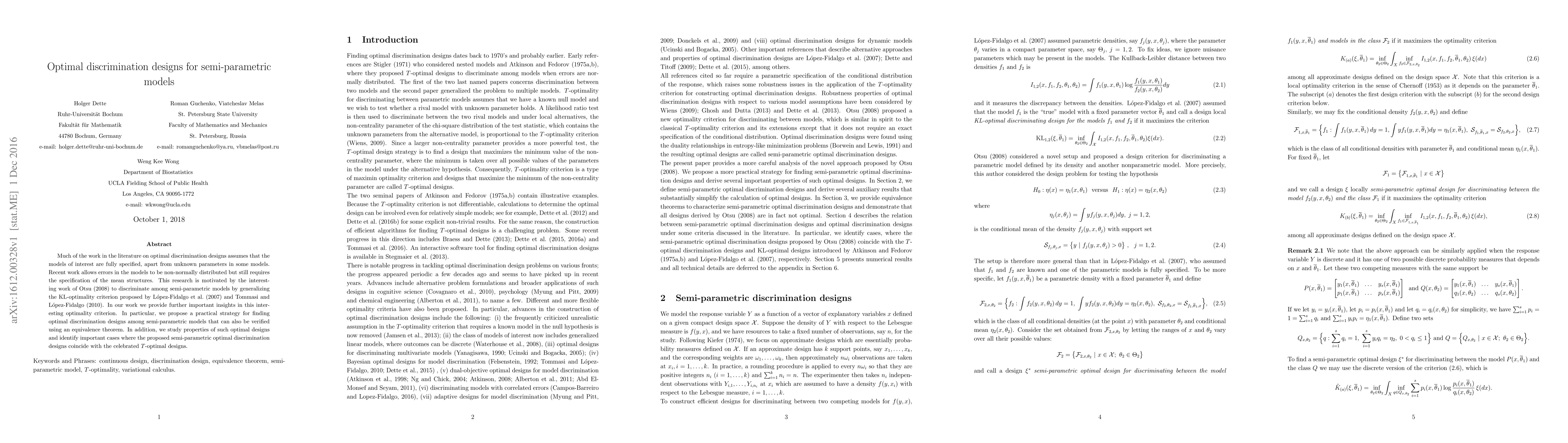 This research develops optimal discrimination designs for semi-parametric models, extending the KL-optimality criterion to handle non-normally distributed errors. It proposes a practical strategy for finding these designs and verifies them using an equivalence theorem, identifying cases where they align with T-optimal designs.