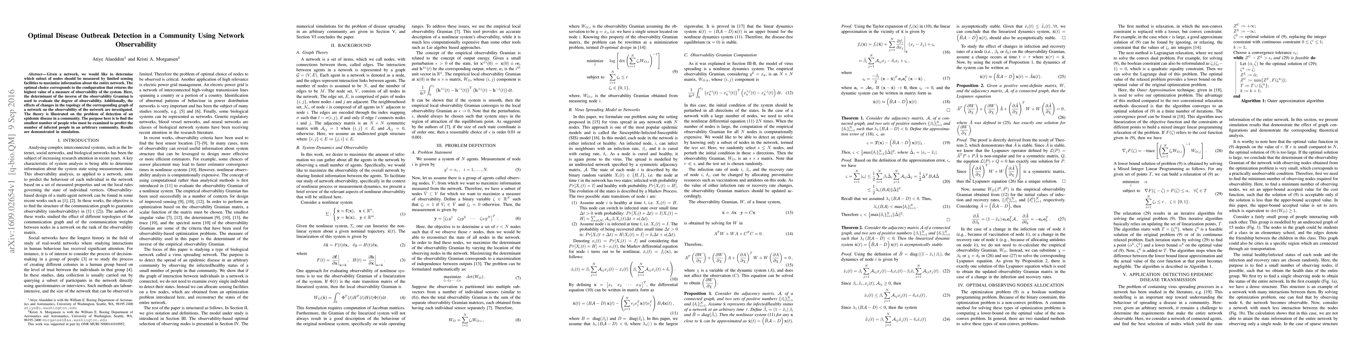 A study investigates how to detect disease outbreaks in a community using network observability, aiming to find the smallest number of people who must be examined to predict the number of infected people.