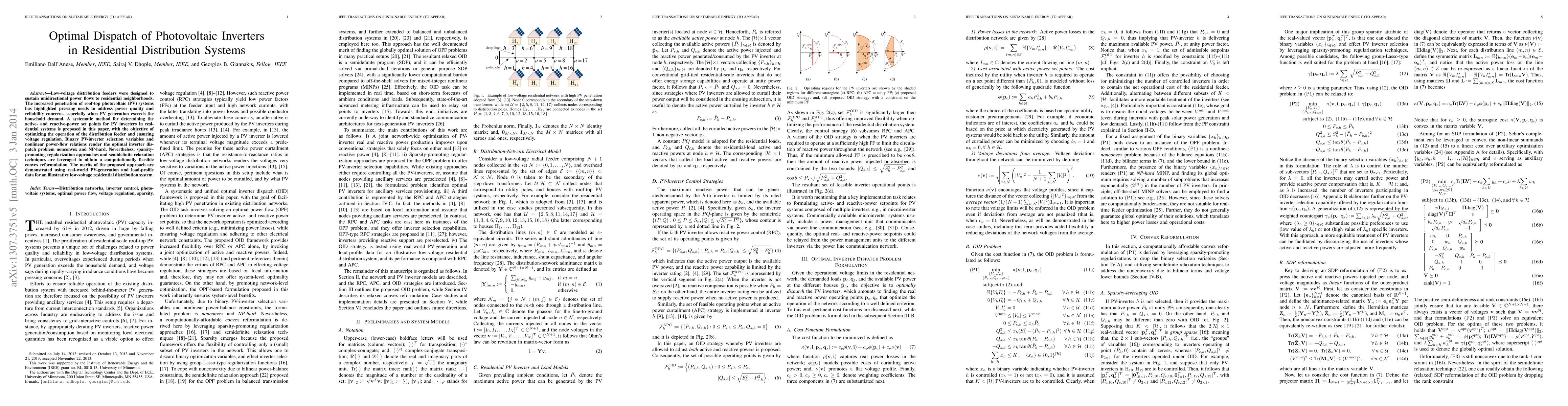 Low-voltage distribution feeders were designed to sustain unidirectional power flows to residential neighborhoods. The increased penetration of roof-top photovoltaic (PV) systems has highlighted pressing needs to address power quality and reliability concerns, especially when PV generation exceeds the household demand. A systematic method for determining the active- and reactive-power set points for PV inverters in residential systems is proposed in this paper, with the objective of optimizing the operation of the distribution feeder and ensuring voltage regulation. Binary PV-inverter selection variables and nonlinear power-flow relations render the novel optimal inverter dispatch problem nonconvex and NP-hard. Nevertheless, sparsity-promoting regularization approaches and semidefinite relaxation techniques are leveraged to obtain a computationally feasible convex reformulation. The merits of the proposed approach are demonstrated using real-world PV-generation and load-profile data for an illustrative low-voltage residential distribution system.