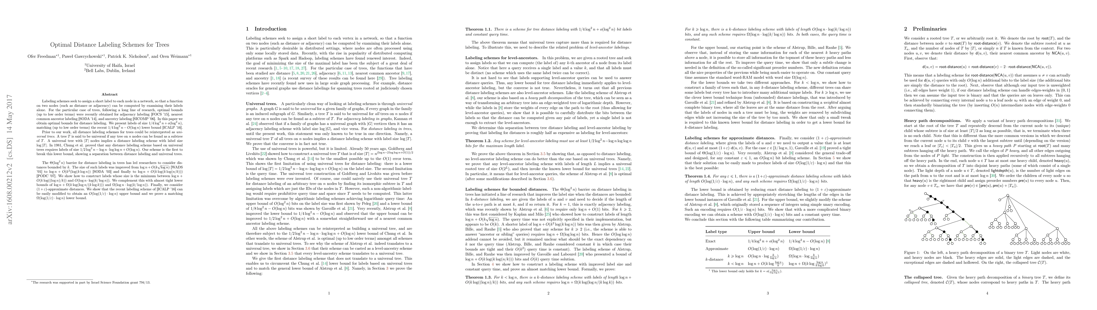This paper presents optimal distance labeling schemes for trees, achieving label sizes of $1/4\log^2n+o(\log^2n)$, matching recent lower bounds and breaking previous bounds based on universal trees. The authors also improve labels for distances bounded by $k$ and provide almost tight lower bounds.