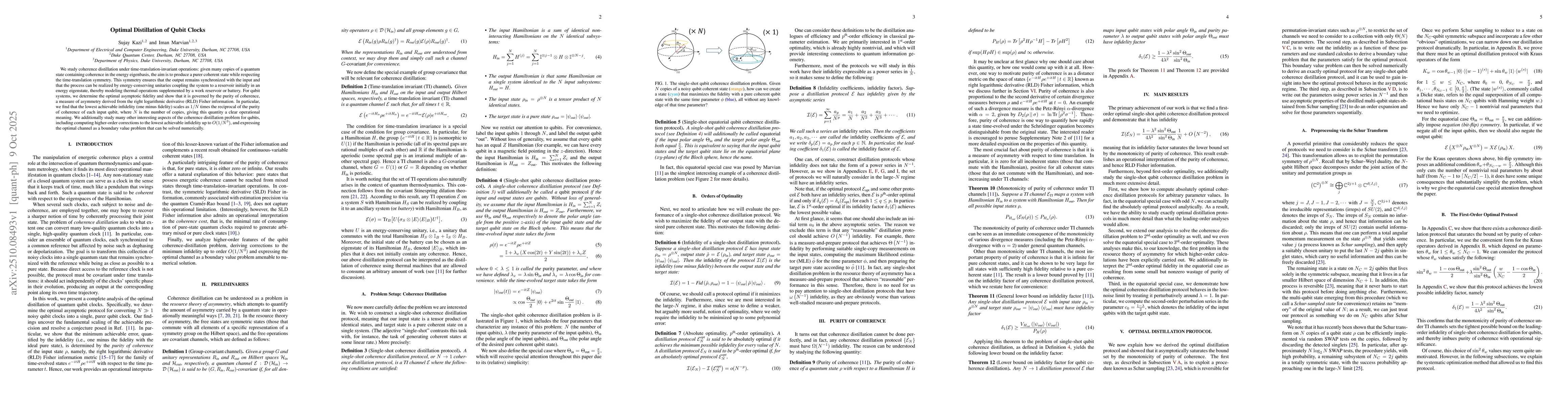 We study coherence distillation under time-translation-invariant operations: given many copies of a quantum state containing coherence in the energy eigenbasis, the aim is to produce a purer coherent state while respecting the time-translation symmetry. This symmetry ensures that the output remains synchronized with the input and that the process can be realized by energy-conserving unitaries coupling the system to a reservoir initially in an energy eigenstate, thereby modeling thermal operations supplemented by a work reservoir or battery. For qubit systems, we determine the optimal asymptotic fidelity and show that it is governed by the purity of coherence, a measure of asymmetry derived from the right logarithmic derivative (RLD) Fisher information. In particular, we find that the lowest achievable infidelity (one minus fidelity) scales as $1/N$ times the reciprocal of the purity of coherence of each input qubit, where $N$ is the number of copies, giving this quantity a clear operational meaning. We additionally study many other interesting aspects of the coherence distillation problem for qubits, including computing higher-order corrections to the lowest achievable infidelity up to $O(1/N^3)$, and expressing the optimal channel as a boundary value problem that can be solved numerically.