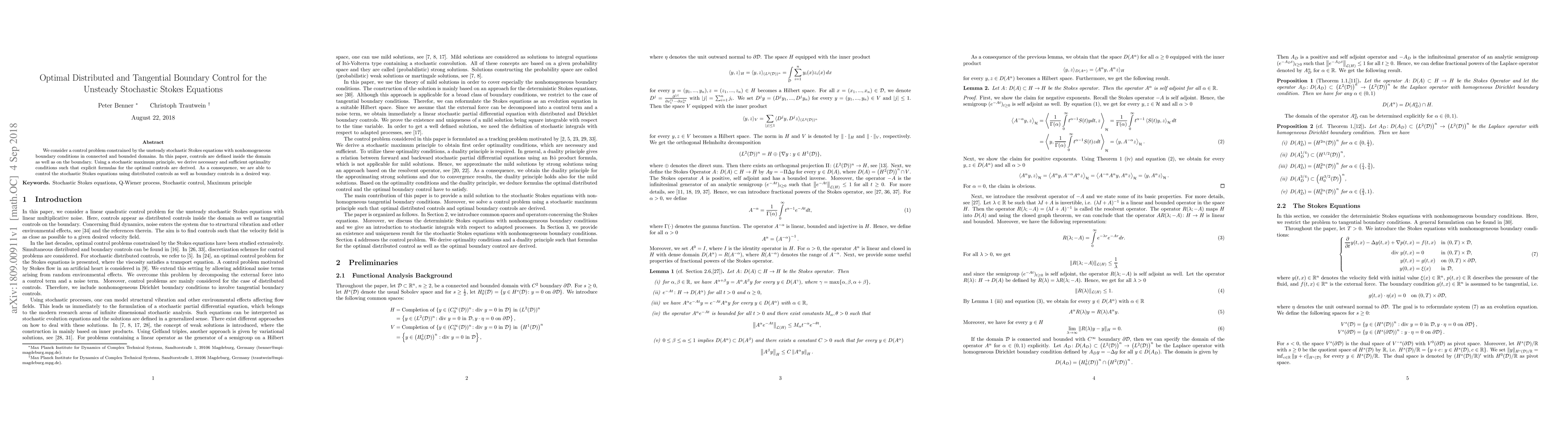This paper develops optimal distributed and tangential boundary control strategies for unsteady stochastic Stokes equations, deriving necessary and sufficient optimality conditions via a stochastic maximum principle. Explicit formulas for the optimal controls enable effective control of the stochastic Stokes equations using both distributed and boundary controls.