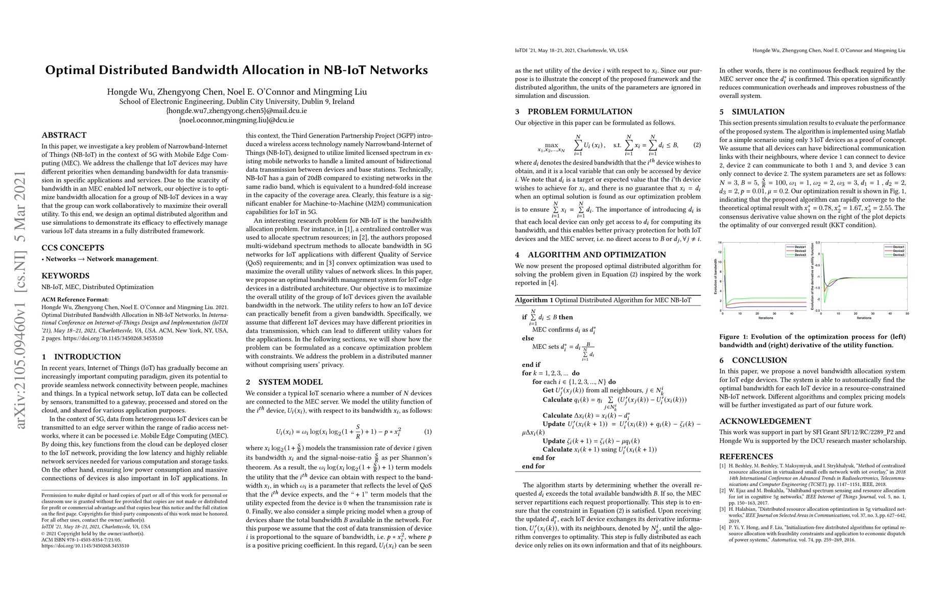 This paper proposes an optimal distributed algorithm for bandwidth allocation in NB-IoT networks, aiming to maximize the overall utility of IoT devices by addressing varying priority demands within a 5G Mobile Edge Computing environment. Simulation results demonstrate the algorithm's effectiveness in managing diverse IoT data streams collaboratively.