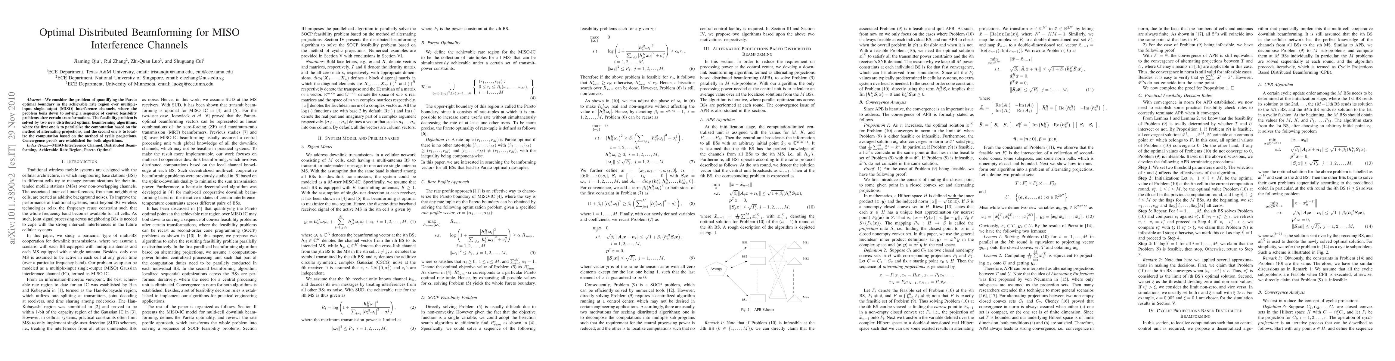 This paper proposes two distributed optimal beamforming algorithms for MISO interference channels to determine the Pareto optimal boundary in achievable rate regions. The algorithms, based on alternating and cyclic projections, are shown to converge and solve the associated convex feasibility problems.