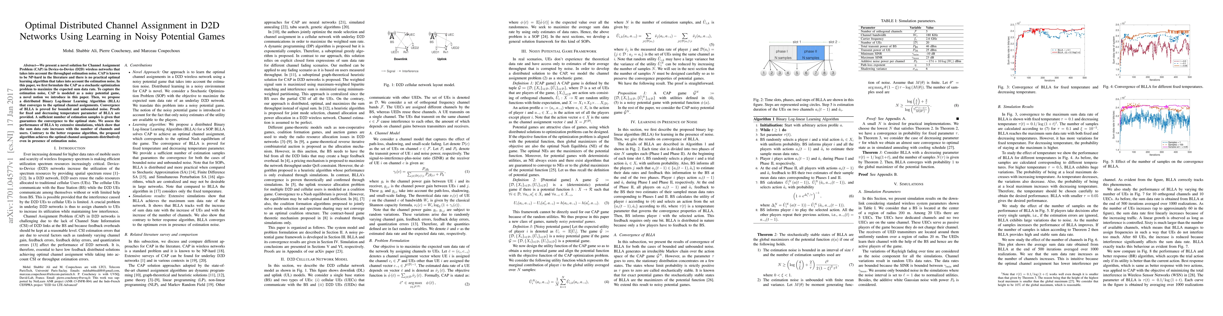 We present a novel solution for Channel Assignment Problem (CAP) in Device-to-Device (D2D) wireless networks that takes into account the throughput estimation noise. CAP is known to be NP-hard in the literature and there is no practical optimal learning algorithm that takes into account the estimation noise. In this paper, we first formulate the CAP as a stochastic optimization problem to maximize the expected sum data rate. To capture the estimation noise, CAP is modeled as a noisy potential game, a novel notion we introduce in this paper. Then, we propose a distributed Binary Log-linear Learning Algorithm (BLLA) that converges to the optimal channel assignments. Convergence of BLLA is proved for bounded and unbounded noise. Proofs for fixed and decreasing temperature parameter of BLLA are provided. A sufficient number of estimation samples is given that guarantees the convergence to the optimal state. We assess the performance of BLLA by extensive simulations, which show that the sum data rate increases with the number of channels and users. Contrary to the better response algorithm, the proposed algorithm achieves the optimal channel assignments distributively even in presence of estimation noise.