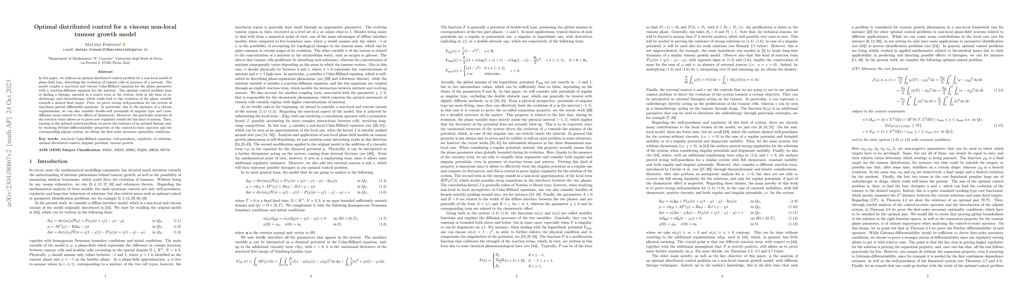 This paper investigates an optimal distributed control problem for a non-local, viscous tumour growth model, combining a phase-field Cahn-Hilliard equation with a reaction-diffusion nutrient equation. The study proves well-posedness and existence of an optimal therapy, deriving necessary optimality conditions through the analysis of the Fr\'echet-differentiability properties.