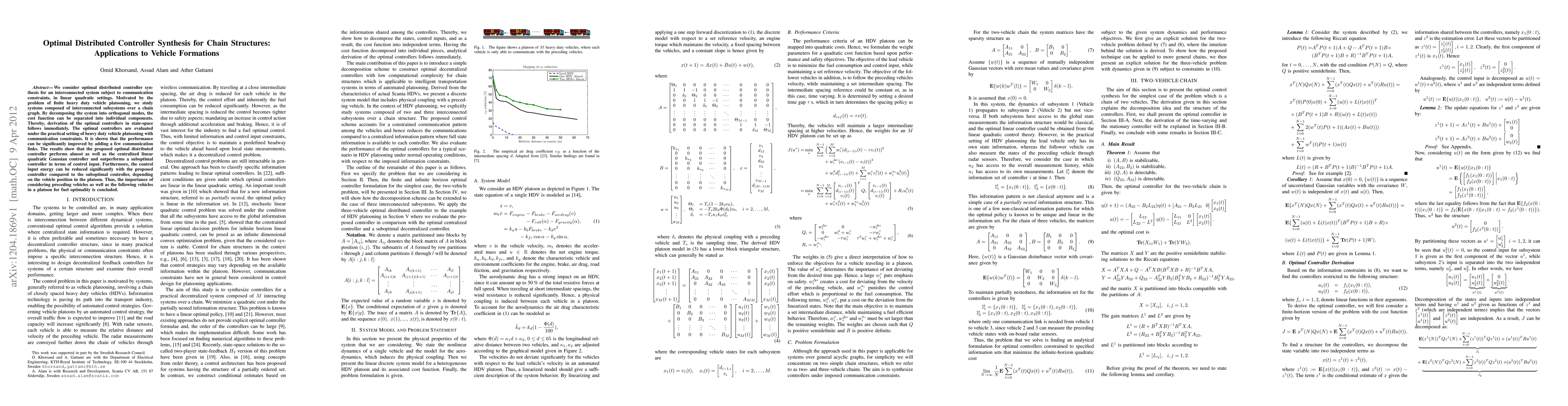 This paper proposes optimal distributed controllers for chain-structured systems, specifically applied to heavy duty vehicle platooning. The method decomposes the system into orthogonal modes, leading to efficient state-space controller derivation and significant performance improvements under communication constraints.