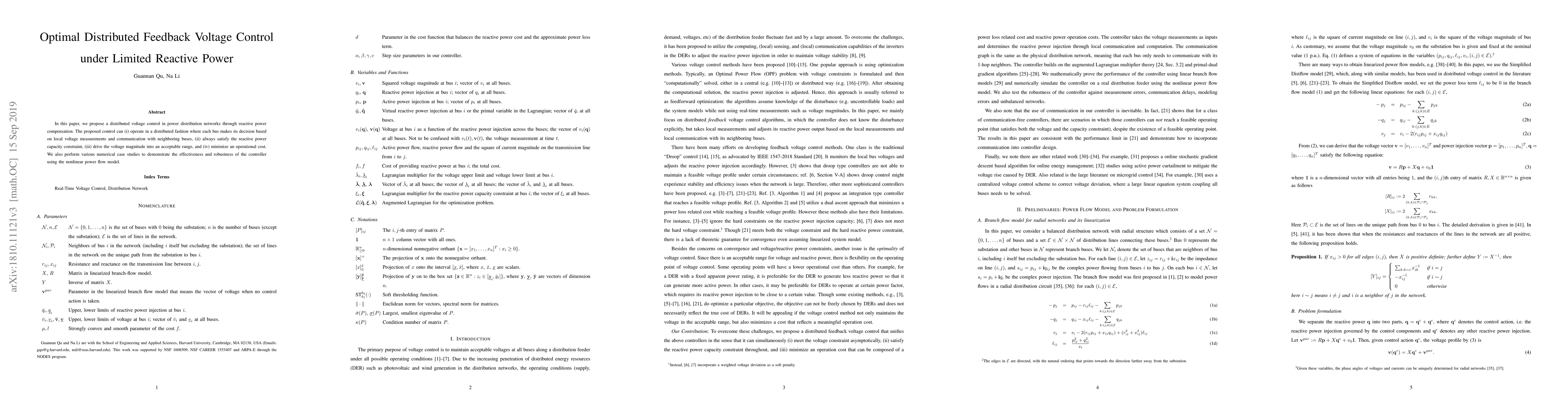 This paper proposes a distributed voltage control method for power distribution networks that uses reactive power compensation. The method operates locally, respects reactive power limits, drives voltages within acceptable ranges, and minimizes operational costs, validated by numerical case studies.