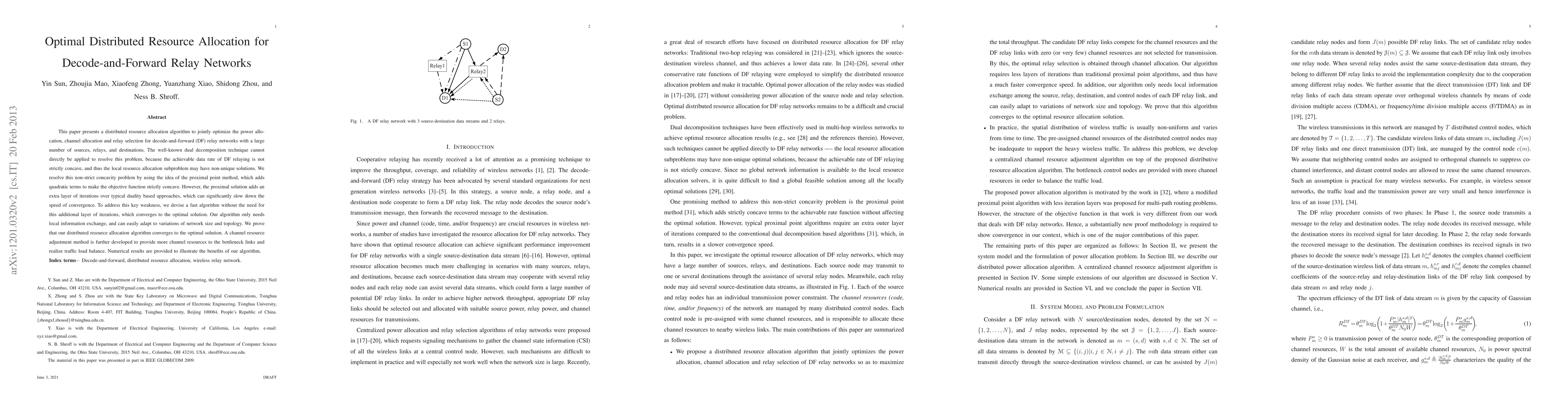 This paper proposes a distributed resource allocation algorithm for decode-and-forward relay networks, addressing non-concavity issues using the proximal point method. The developed fast algorithm converges to the optimal solution with local information exchange and adapts to network variations, while a channel resource adjustment method enhances traffic load balance.