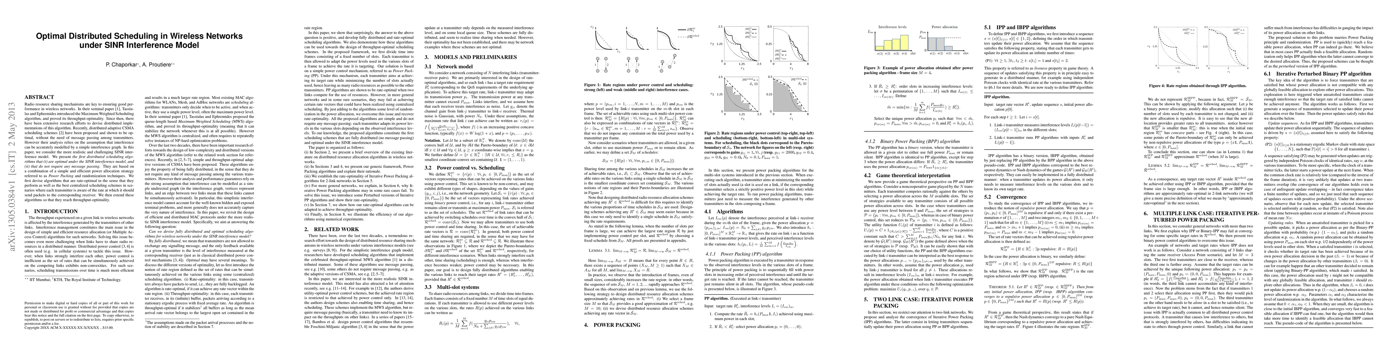 This paper presents the first distributed scheduling algorithms that are optimal under the SINR interference model and do not require message passing. The algorithms combine a power allocation strategy called Power Packing with randomization techniques and achieve rate-optimality and throughput-optimality.