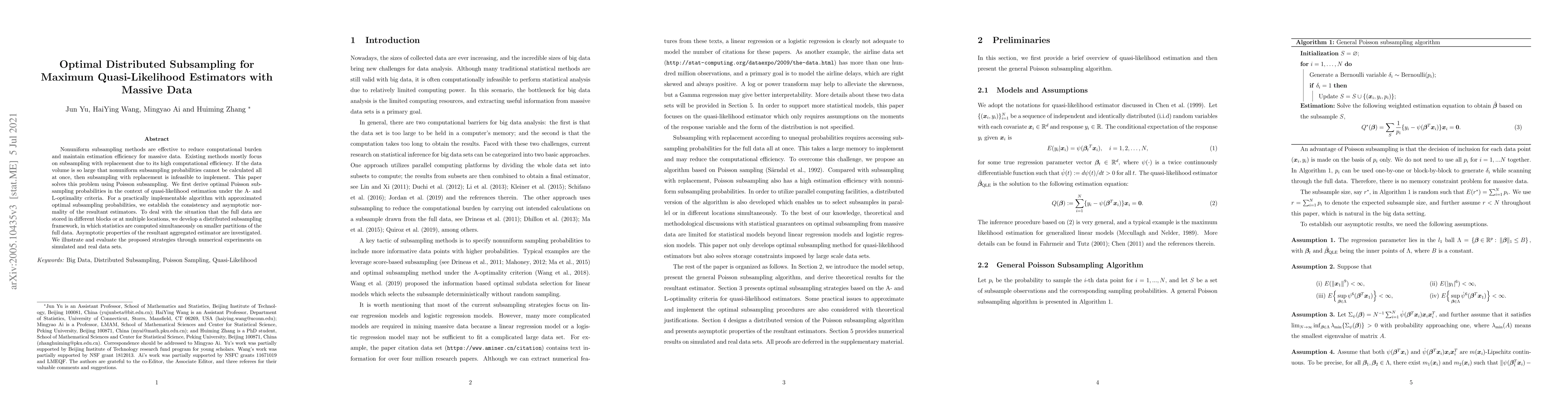 This paper proposes optimal distributed subsampling methods using Poisson subsampling for maximum quasi-likelihood estimators with massive data. It develops a distributed framework to handle data stored across multiple locations, ensuring consistency and asymptotic normality of the estimators.