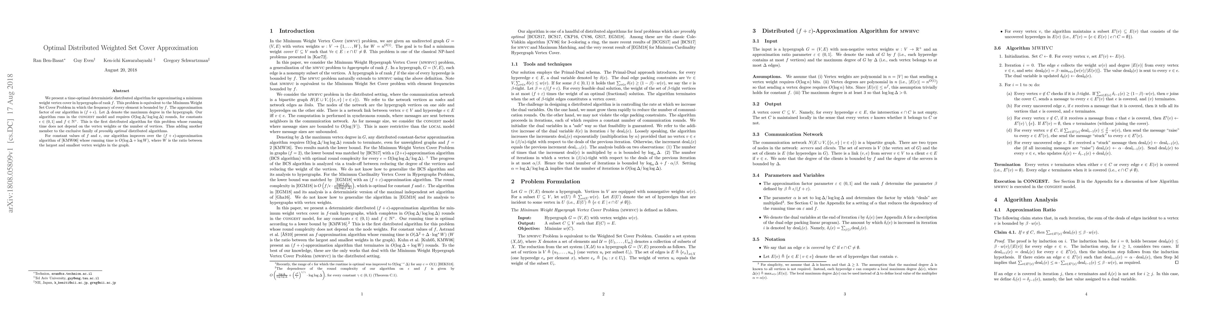 We present a time-optimal deterministic distributed algorithm for approximating a minimum weight vertex cover in hypergraphs of rank $f$. This problem is equivalent to the Minimum Weight Set Cover Problem in which the frequency of every element is bounded by $f$. The approximation factor of our algorithm is $(f+\epsilon)$. Let $\Delta$ denote the maximum degree in the hypergraph. Our algorithm runs in the CONGEST model and requires $O(\log{\Delta} / \log \log \Delta)$ rounds, for constants $\epsilon \in (0,1]$ and $f\in\mathbb N^+$. This is the first distributed algorithm for this problem whose running time does not depend on the vertex weights or the number of vertices. Thus adding another member to the exclusive family of \emph{provably optimal} distributed algorithms. For constant values of $f$ and $\epsilon$, our algorithm improves over the $(f+\epsilon)$-approximation algorithm of \cite{KuhnMW06} whose running time is $O(\log \Delta + \log W)$, where $W$ is the ratio between the largest and smallest vertex weights in the graph.