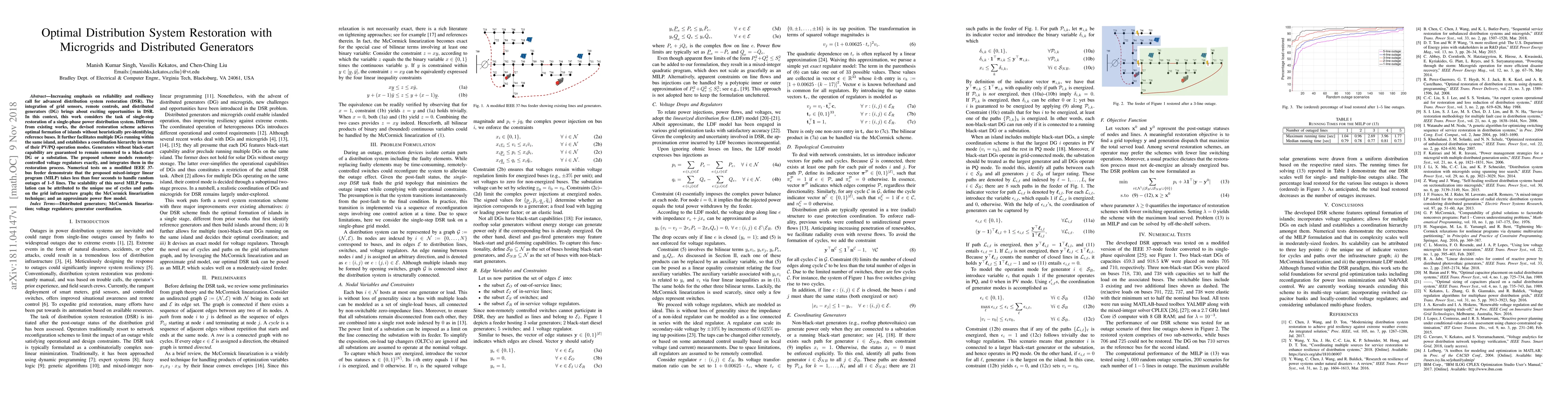Increasing emphasis on reliability and resiliency call for advanced distribution system restoration (DSR). The integration of grid sensors, remote controls, and distributed generators (DG) brings about exciting opportunities in DSR. In this context, this work considers the task of single-step restoration of a single phase power distribution system. Different from existing works, the devised restoration scheme achieves optimal formation of islands without heuristically pre-identifying reference buses. It further facilitates multiple DGs running within the same island, and establishes a coordination hierarchy in terms of their PV/PQ operation modes. Generators without black-start capability are guaranteed to remain connected to a black-start DG or a substation. The proposed scheme models remotely-controlled voltage regulators exactly, and integrates them in the restoration process. Numerical tests on a modified IEEE 37-bus feeder demonstrate that the proposed mixed-integer linear program (MILP) takes less than four seconds to handle random outages of 1-5 lines. The scalability of this novel MILP formulation can be attributed to the unique use of cycles and paths on the grid infrastructure graph; the McCormick linearization technique; and an approximate power flow model.