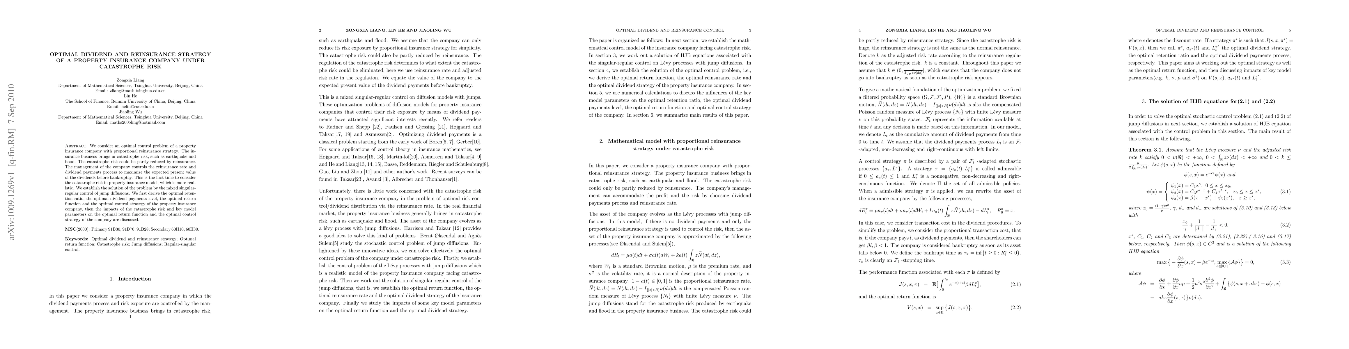 This paper explores an optimal control problem for a property insurance company managing catastrophe risks through reinsurance. It derives optimal strategies for reinsurance and dividend payments to maximize expected present value before bankruptcy, considering the first realistic model for catastrophe risk in property insurance. The solution employs mixed singular-regular control of jump diffusions.