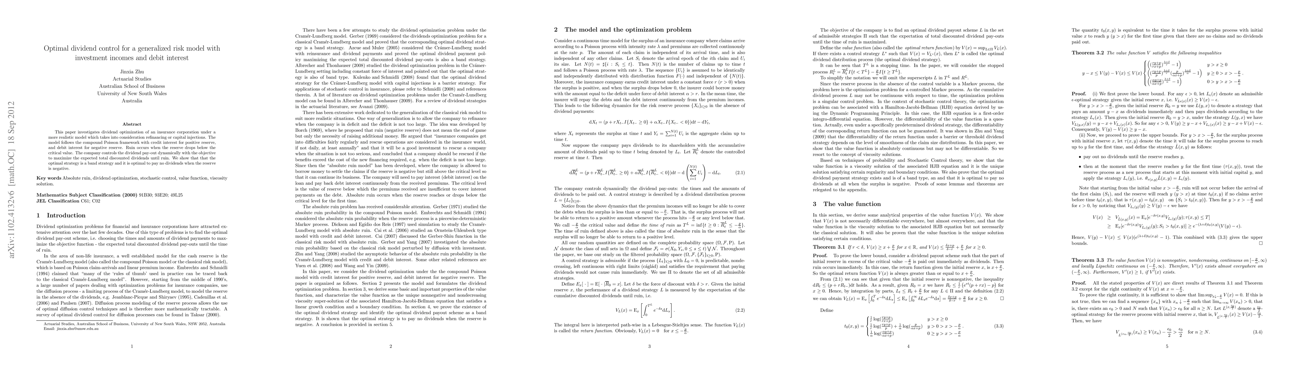 This paper optimizes dividend payouts for an insurance firm under a generalized risk model that includes investment incomes and interest charges, aiming to maximize expected total discounted dividends until ruin. The optimal strategy is a band strategy that avoids paying dividends when the reserve is negative.