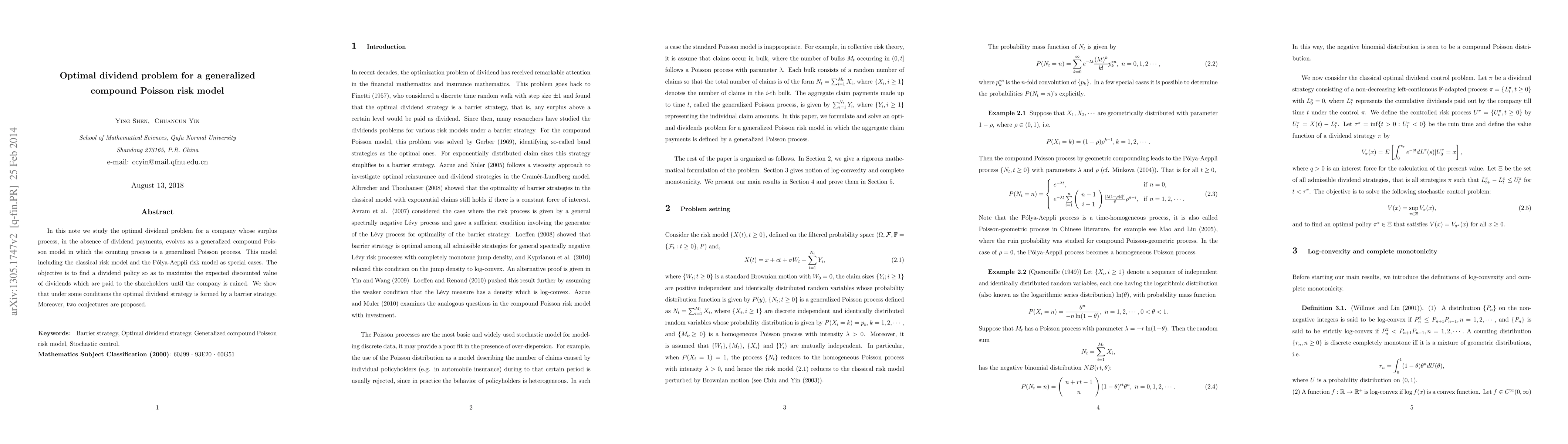 This paper investigates the optimal dividend policy for a generalized compound Poisson risk model, aiming to maximize the expected discounted value of dividends before the company's ruin. The optimal strategy is shown to be a barrier strategy under certain conditions.