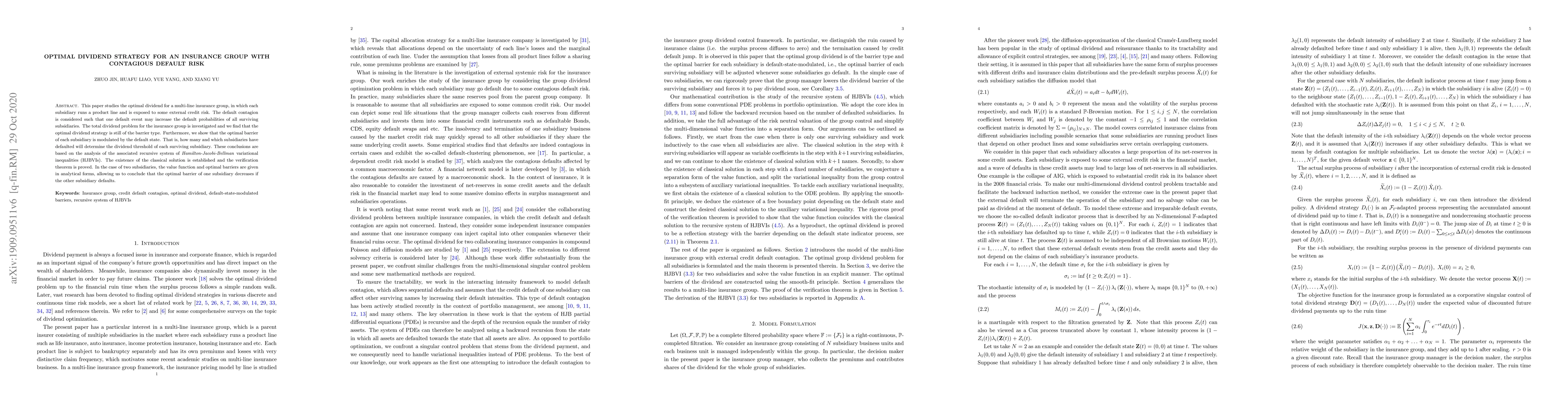 This paper investigates the optimal dividend strategy for a multi-line insurance group facing contagious default risk, finding that the optimal strategy is barrier-type and modulated by the default state of other subsidiaries. Analytical results for the two-subsidiary case show that one subsidiary's optimal barrier decreases if the other defaults.