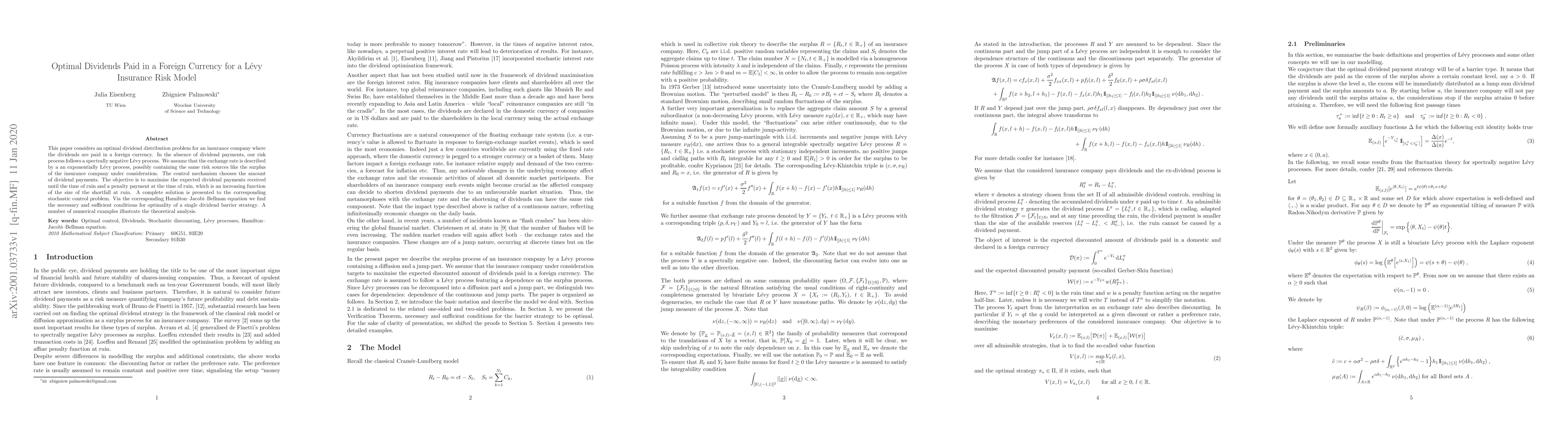 This paper considers an optimal dividend distribution problem for an insurance company where the dividends are paid in a foreign currency. In the absence of dividend payments, our risk process follows a spectrally negative L\'evy process. We assume that the exchange rate is described by a an exponentially L\'evy process, possibly containing the same risk sources like the surplus of the insurance company under consideration. The control mechanism chooses the amount of dividend payments. The objective is to maximise the expected dividend payments received until the time of ruin and a penalty payment at the time of ruin, which is an increasing function of the size of the shortfall at ruin. A complete solution is presented to the corresponding stochastic control problem. Via the corresponding Hamilton--Jacobi--Bellman equation we find the necessary and sufficient conditions for optimality of a single dividend barrier strategy. A number of numerical examples illustrate the theoretical analysis.