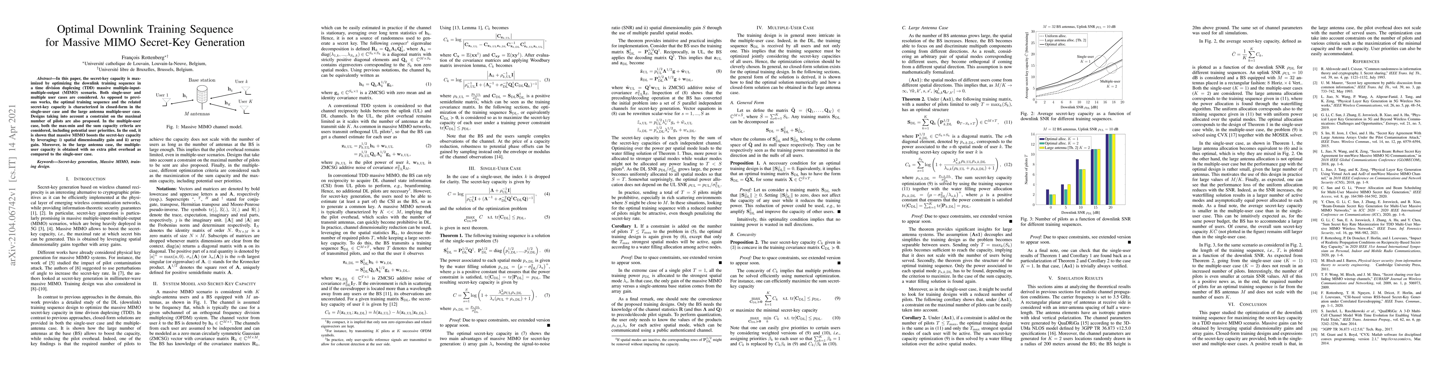 This paper optimizes downlink training sequences in massive MIMO for maximizing secret-key capacity, providing closed-form solutions for single-user and large-scale multiple-user scenarios. It demonstrates that massive MIMO enhances secret-key capacity through spatial dimensionality and array gain, with no extra pilot overhead in the large-antenna multiple-user case.