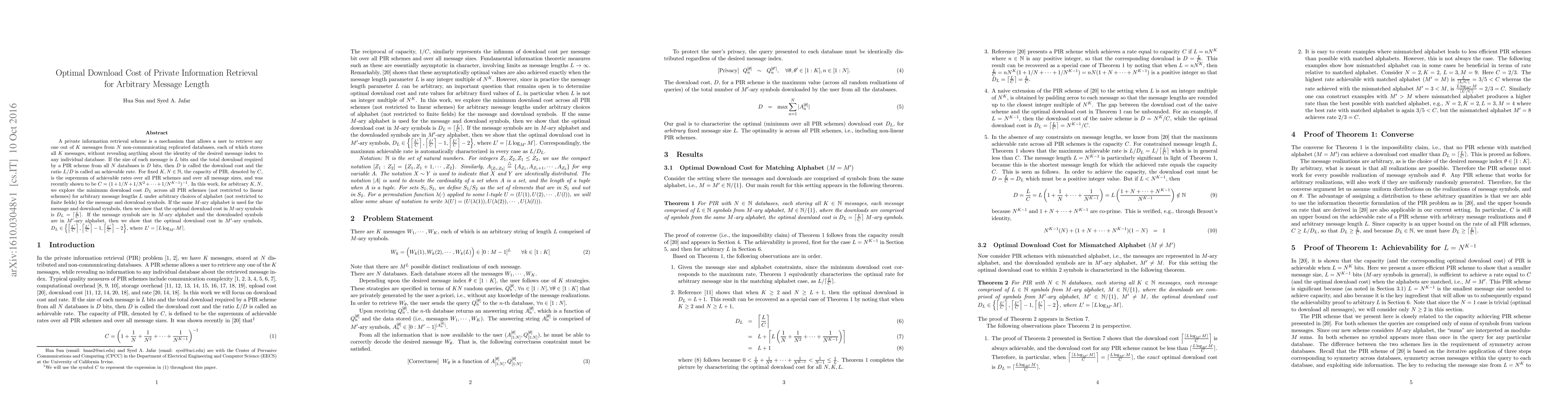This paper explores the optimal download cost for private information retrieval (PIR) schemes across various message lengths and alphabets. It finds that the minimum download cost is $\lceil\frac{L}{C}\rceil$ when the same alphabet is used for messages and downloads, and $\left\{\left\lceil \frac{L'}{C}\right\rceil,\left\lceil \frac{L'}{C}\right\rceil-1,\left\lceil \frac{L'}{C}\right\rceil-2\right\}$ when different alphabets are used.