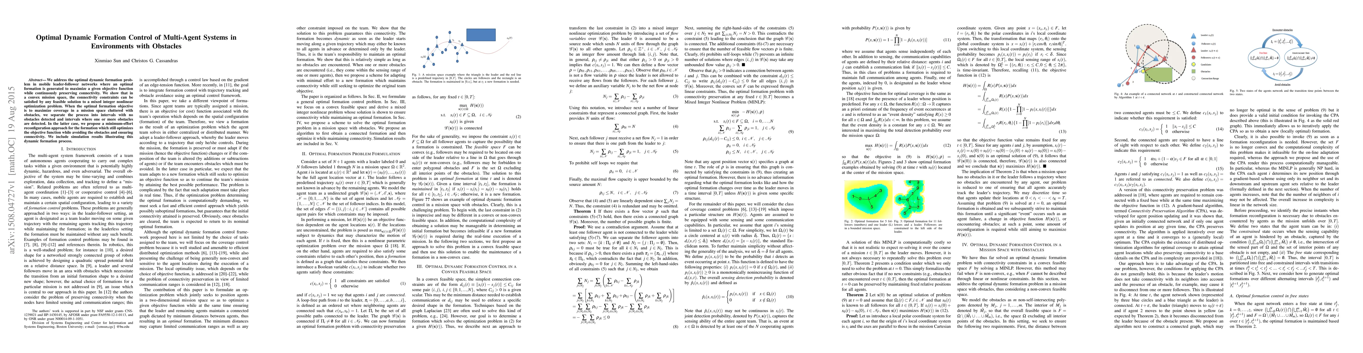 We address the optimal dynamic formation problem in mobile leader-follower networks where an optimal formation is generated to maximize a given objective function while continuously preserving connectivity. We show that in a convex mission space, the connectivity constraints can be satisfied by any feasible solution to a mixed integer nonlinear optimization problem. When the optimal formation objective is to maximize coverage in a mission space cluttered with obstacles, we separate the process into intervals with no obstacles detected and intervals where one or more obstacles are detected. In the latter case, we propose a minimum-effort reconfiguration approach for the formation which still optimizes the objective function while avoiding the obstacles and ensuring connectivity. We include simulation results illustrating this dynamic formation process.