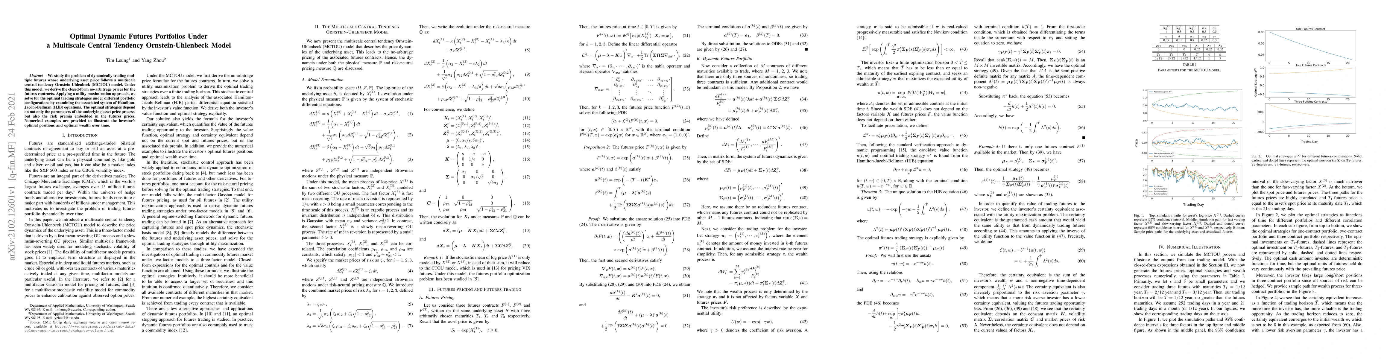 We study the problem of dynamically trading multiple futures whose underlying asset price follows a multiscale central tendency Ornstein-Uhlenbeck (MCTOU) model. Under this model, we derive the closed-form no-arbitrage prices for the futures contracts. Applying a utility maximization approach, we solve for the optimal trading strategies under different portfolio configurations by examining the associated system of Hamilton-Jacobi-Bellman (HJB) equations. The optimal strategies depend on not only the parameters of the underlying asset price process but also the risk premia embedded in the futures prices. Numerical examples are provided to illustrate the investor's optimal positions and optimal wealth over time.