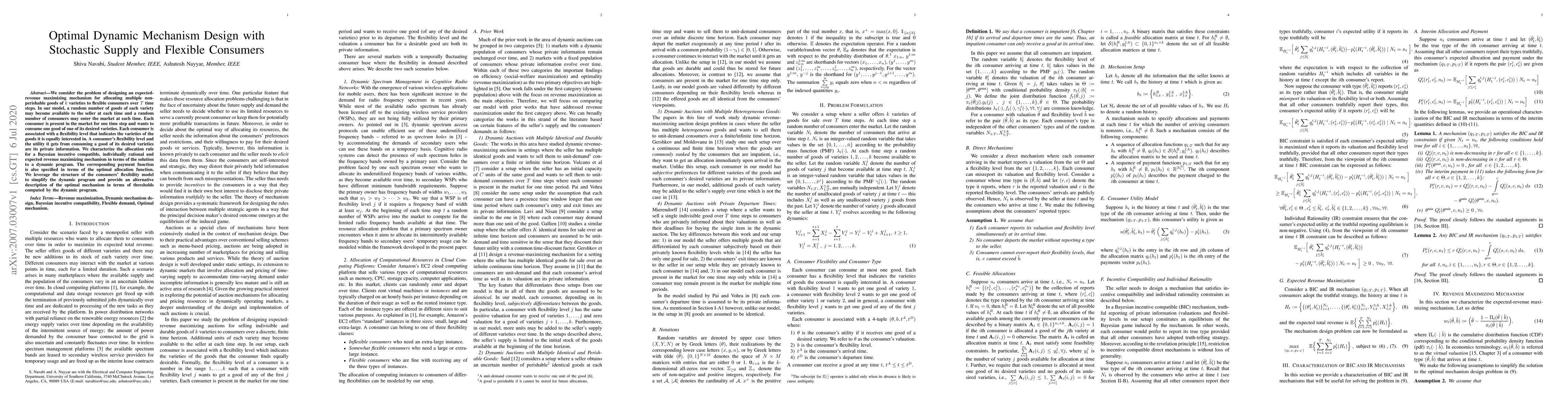 We consider the problem of designing an expected-revenue maximizing mechanism for allocating multiple non-perishable goods of $k$ varieties to flexible consumers over $T$ time steps. In our model, a random number of goods of each variety may become available to the seller at each time and a random number of consumers may enter the market at each time. Each consumer is present in the market for one time step and wants to consume one good of one of its desired varieties. Each consumer is associated with a flexibility level that indicates the varieties of the goods it is equally interested in. A consumer's flexibility level and the utility it gets from consuming a good of its desired varieties are its private information. We characterize the allocation rule for a Bayesian incentive compatible, individually rational and expected revenue maximizing mechanism in terms of the solution to a dynamic program. The corresponding payment function is also specified in terms of the optimal allocation function. We leverage the structure of the consumers' flexibility model to simplify the dynamic program and provide an alternative description of the optimal mechanism in terms of thresholds computed by the dynamic program.
