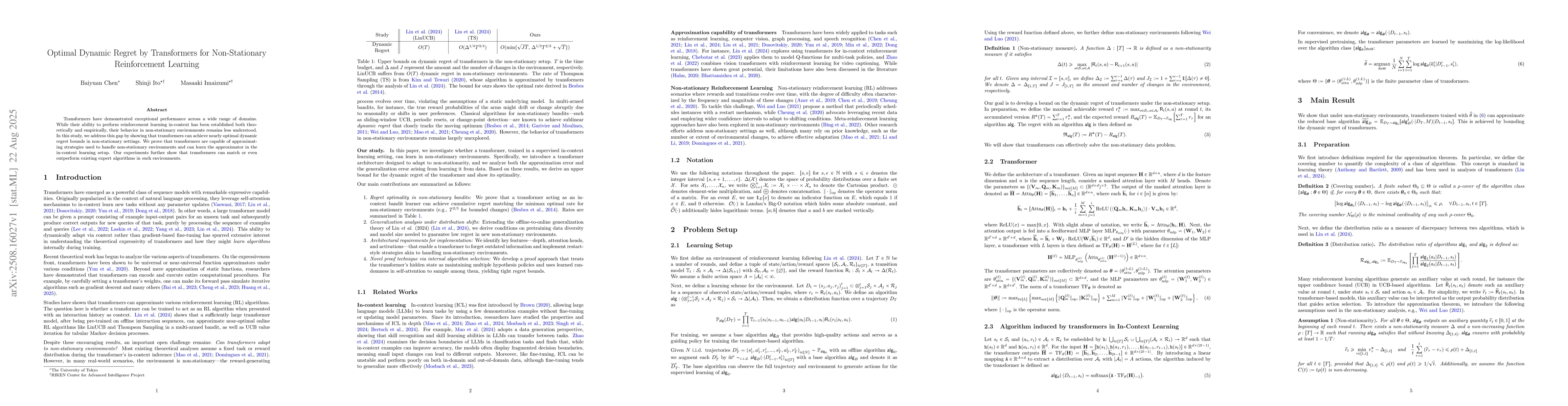 Transformers have demonstrated exceptional performance across a wide range of domains. While their ability to perform reinforcement learning in-context has been established both theoretically and empirically, their behavior in non-stationary environments remains less understood. In this study, we address this gap by showing that transformers can achieve nearly optimal dynamic regret bounds in non-stationary settings. We prove that transformers are capable of approximating strategies used to handle non-stationary environments and can learn the approximator in the in-context learning setup. Our experiments further show that transformers can match or even outperform existing expert algorithms in such environments.