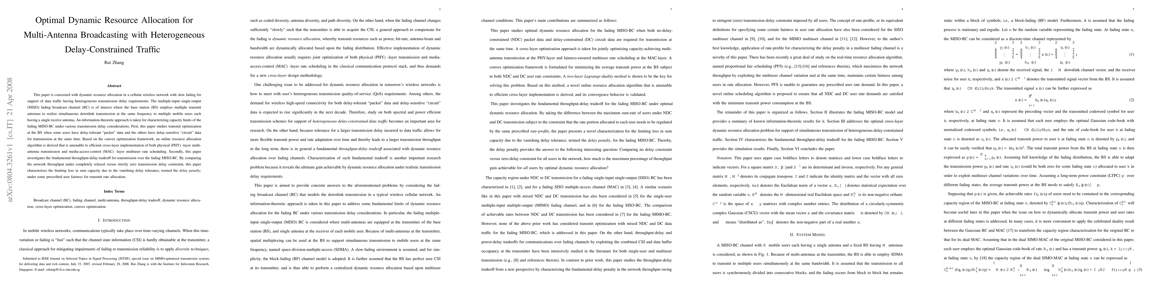 This paper is concerned with dynamic resource allocation in a cellular wireless network with slow fading for support of data traffic having heterogeneous transmission delay requirements. The multiple-input single-output (MISO) fading broadcast channel (BC) is of interest where the base station (BS) employs multiple transmit antennas to realize simultaneous downlink transmission at the same frequency to multiple mobile users each having a single receive antenna. An information-theoretic approach is taken for characterizing capacity limits of the fading MISO-BC under various transmission delay considerations. First, this paper studies transmit optimization at the BS when some users have delay-tolerant ``packet'' data and the others have delay-sensitive ``circuit'' data for transmission at the same time. Based on the convex optimization framework, an online resource allocation algorithm is derived that is amenable to efficient cross-layer implementation of both physical (PHY) -layer multi-antenna transmission and media-access-control (MAC) -layer multiuser rate scheduling. Secondly, this paper investigates the fundamental throughput-delay tradeoff for transmission over the fading MISO-BC. By comparing the network throughput under completely relaxed versus strictly zero transmission delay constraint, this paper characterizes the limiting loss in sum capacity due to the vanishing delay tolerance, termed the delay penalty, under some prescribed user fairness for transmit rate allocation.