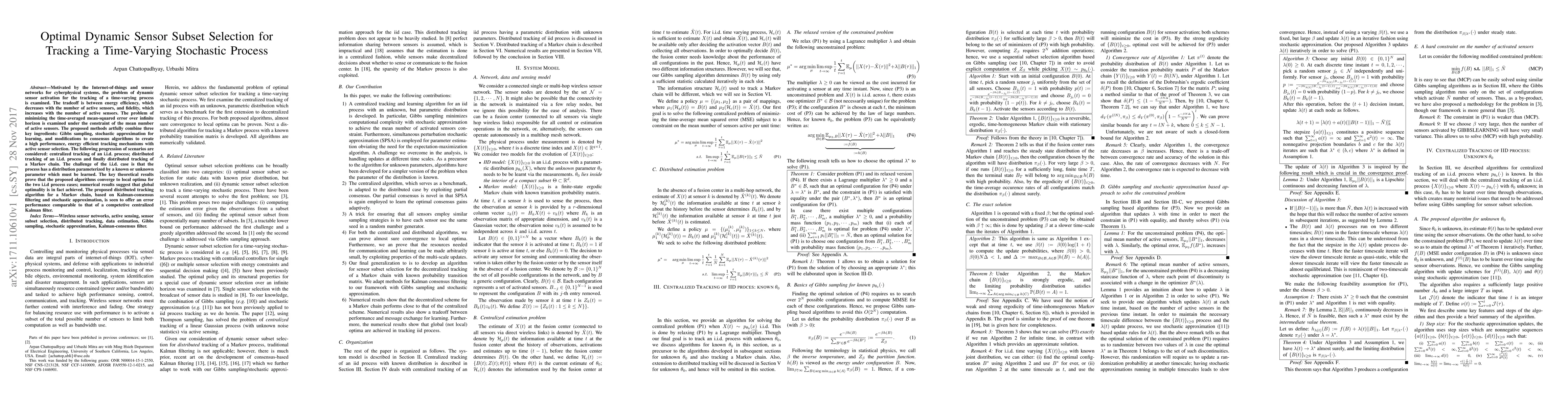 This paper proposes dynamic sensor subset selection methods for tracking time-varying stochastic processes, balancing energy efficiency and fidelity. The algorithms combine Gibbs sampling, stochastic approximation, and consensus modifications to achieve optimal performance. Theoretical and numerical results show convergence to local optima and competitive error performance in distributed tracking scenarios.
