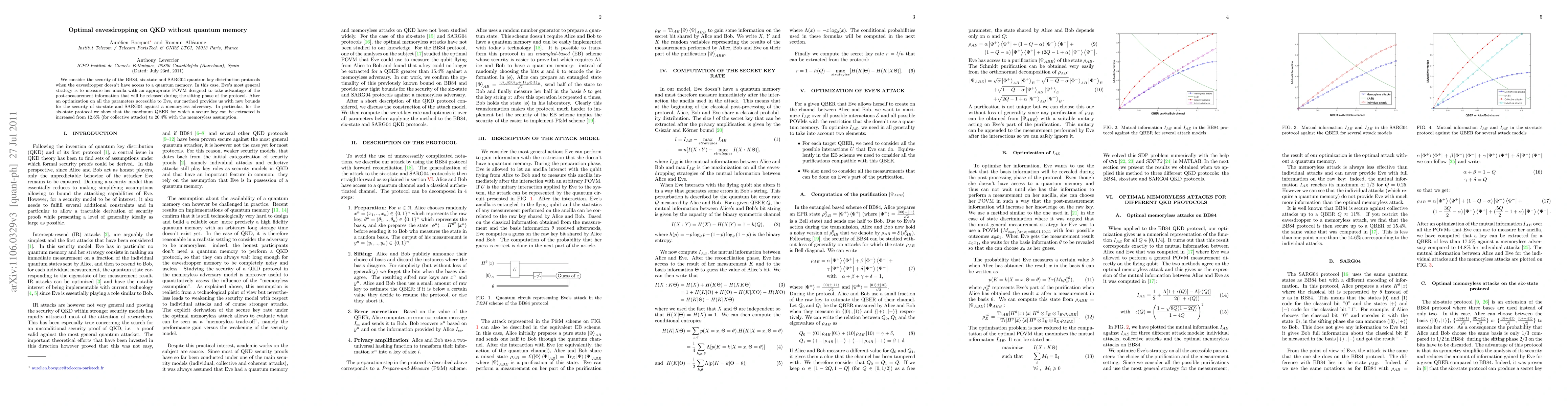 This paper optimizes eavesdropping strategies for BB84, six-state, and SARG04 quantum key distribution protocols without quantum memory, revealing new security bounds for six-state and SARG04. For the six-state protocol, it increases the maximum tolerable QBER for secure key extraction from 12.6% to 20.4% under memoryless attacks.