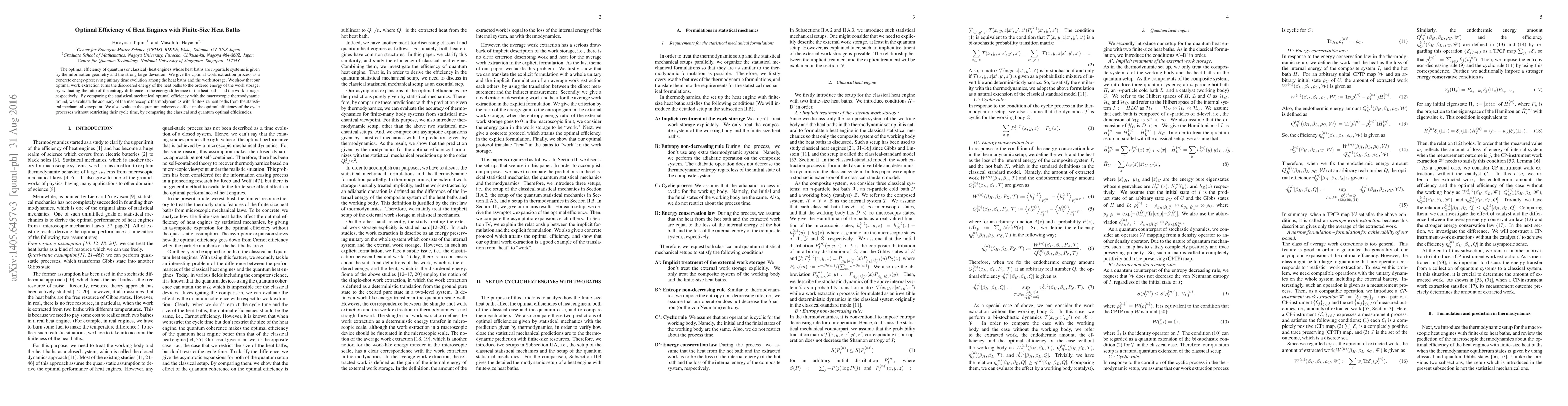 The optimal efficiency of quantum (or classical) heat engines whose heat baths are $n$-particle systems is given by the information geometry and the strong large deviation. We give the optimal work extraction process as a concrete energy-preserving unitary time evolution among the heat baths and the work storage. We show that our optimal work extraction turns the disordered energy of the heat baths to the ordered energy of the work storage, by evaluating the ratio of the entropy difference to the energy difference in the heat baths and the work storage, respectively. By comparing the statistical mechanical optimal efficiency with the macroscopic thermodynamic bound, we evaluate the accuracy of the macroscopic thermodynamics with finite-size heat baths from the statistical mechanical viewpoint. We also evaluate the quantum coherence effect on the optimal efficiency of the cycle processes without restricting their cycle time, by comparing the classical and quantum optimal efficiencies.