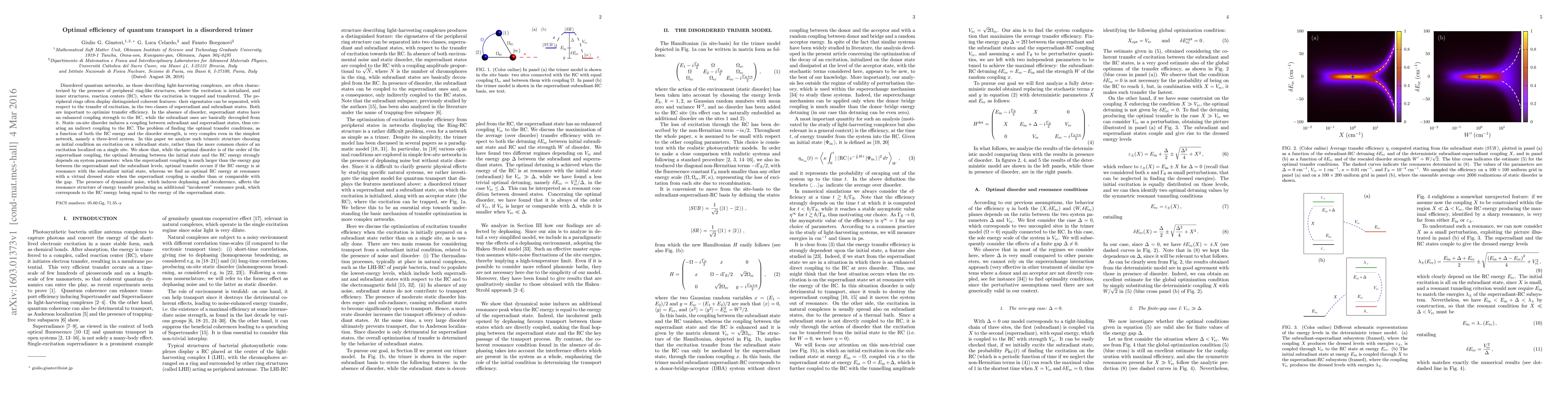 Disordered quantum networks, as those describing light-harvesting complexes, are often characterized by the presence of peripheral ring-like structures, where the excitation is initialized, and inner reaction centers (RC), where the excitation is trapped. The peripheral rings display coherent features: their eigenstates can be separated in the two classes of superradiant and subradiant states. Both are important to optimize transfer efficiency. In the absence of disorder, superradiant states have an enhanced coupling strength to the RC, while the subradiant ones are basically decoupled from it. Static on-site disorder induces a coupling between subradiant and superradiant states, creating an indirect coupling to the RC. The problem of finding the optimal transfer conditions, as a function of both the RC energy and the disorder strength, is very complex even in the simplest network, namely a three-level system. In this paper we analyze such trimeric structure choosing as initial condition a subradiant state, rather than the more common choice of an excitation localized on a site. We show that, while the optimal disorder is of the order of the superradiant coupling, the optimal detuning between the initial state and the RC energy strongly depends on system parameters: when the superradiant coupling is much larger than the energy gap between the superradiant and the subradiant levels, optimal transfer occurs if the RC energy is at resonance with the subradiant initial state, whereas we find an optimal RC energy at resonance with a virtual dressed state when the superradiant coupling is smaller than or comparable with the gap. The presence of dynamical noise, which induces dephasing and decoherence, affects the resonance structure of energy transfer producing an additional 'incoherent' resonance peak, which corresponds to the RC energy being equal to the energy of the superradiant state.