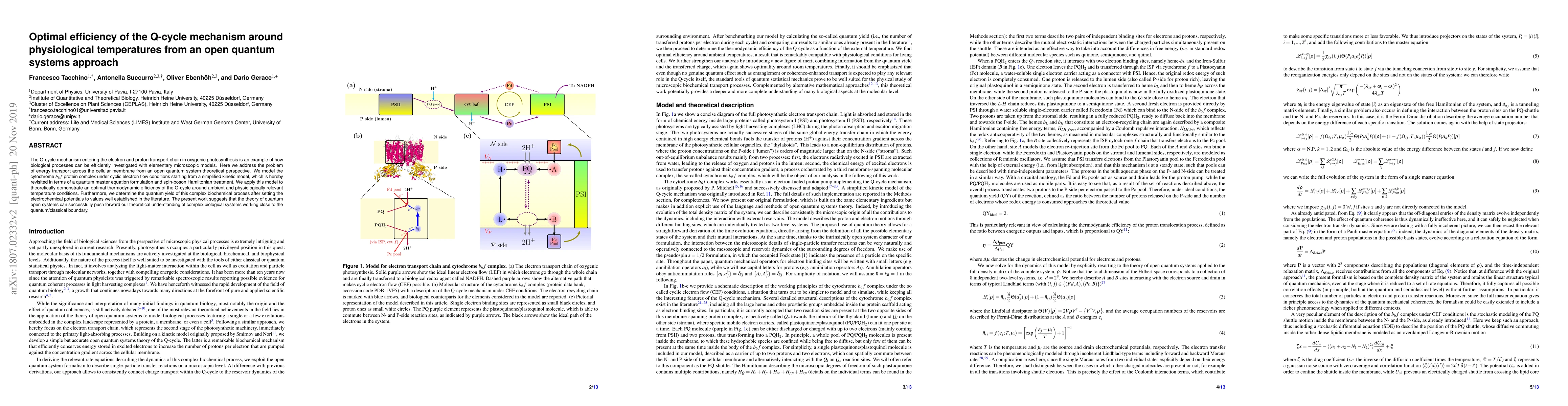 The Q-cycle mechanism entering the electron and proton transport chain in oxygenic photosynthesis is an example of how biological processes can be efficiently investigated with elementary microscopic models. Here we address the problem of energy transport across the cellular membrane from an open quantum system theoretical perspective. We model the cytochrome $b_6f$ protein complex under cyclic electron flow conditions starting from a simplified kinetic model, which is hereby revisited in terms of a quantum master equation formulation and spin-boson Hamiltonian treatment. We apply this model to theoretically demonstrate an optimal thermodynamic efficiency of the Q-cycle around ambient and physiologically relevant temperature conditions. Furthermore, we determine the quantum yield of this complex biochemical process after setting the electrochemical potentials to values well established in the literature. The present work suggests that the theory of quantum open systems can successfully push forward our theoretical understanding of complex biological systems working close to the quantum/classical boundary.