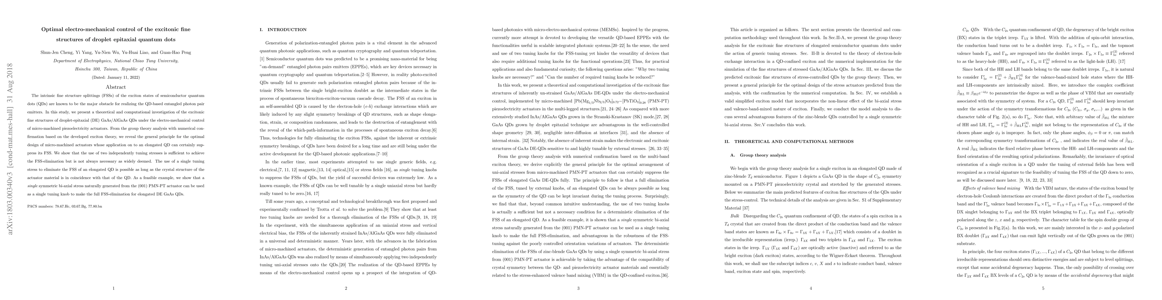 The intrinsic fine structure splittings (FSSs) of the exciton states of semiconductor quantum dots (QDs) are known to be the major obstacle for realizing the QD-based entangled photon pair emitters. In this study, we present a theoretical and computational investigation of the excitonic fine structures of droplet-epitaxial (DE) GaAs/AlGaAs QDs under the electro-mechanical control of micro-machined piezoelectricity actuators. From the group theory analysis with numerical confirmation based on the developed exciton theory, we reveal the general principle for the optimal design of micro-machined actuators whose application on to an elongated QD can certainly suppress its FSS. We show that the use of two independently tuning stresses is sufficient to achieve the FSS-elimination but is not always necessary as widely deemed. The use of a single tuning stress to eliminate the FSS of an elongated QD is possible as long as the crystal structure of the actuator material is in coincidence with that of the QD. As a feasible example, we show that a {\it single} symmetric bi-axial stress naturally generated from the $(001)$ PMN-PT actuator can be used as a single tuning knob to make the full FSS-elimination for elongated DE GaAs QDs.
