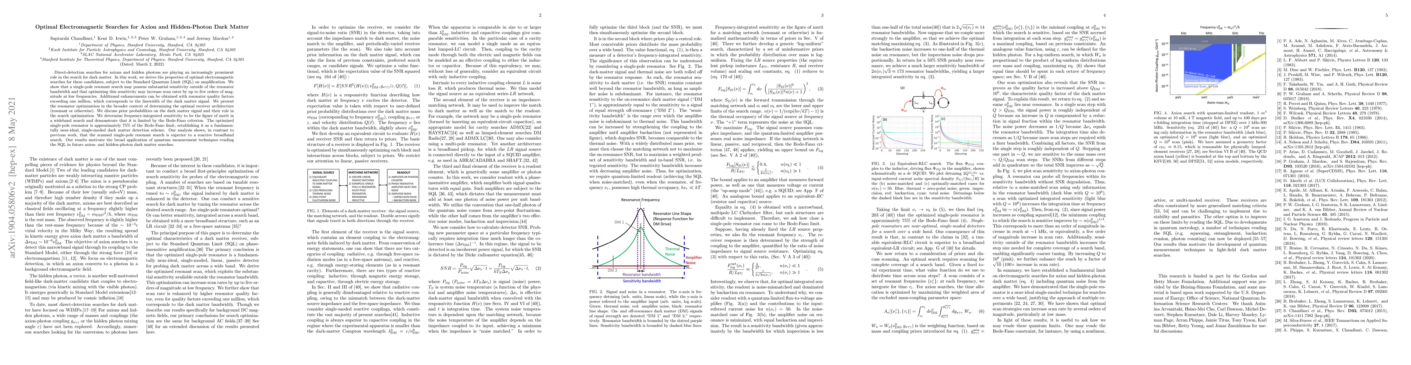 Direct-detection searches for axions and hidden photons are playing an increasingly prominent role in the search for dark matter. In this work, we derive the properties of optimal electromagnetic searches for these candidates, subject to the Standard Quantum Limit (SQL) on amplification. We show that a single-pole resonant search may possess substantial sensitivity outside of the resonator bandwidth and that optimizing this sensitivity may increase scan rates by up to five orders of magnitude at low frequencies. Additional enhancements can be obtained with resonator quality factors exceeding one million, which corresponds to the linewidth of the dark matter signal. We present the resonator optimization in the broader context of determining the optimal receiver architecture (resonant or otherwise). We discuss prior probabilities on the dark matter signal and their role in the search optimization. We determine frequency-integrated sensitivity to be the figure of merit in a wideband search and demonstrate that it is limited by the Bode-Fano criterion. The optimized single-pole resonator is approximately 75% of the Bode-Fano limit, establishing it as a fundamentally near-ideal, single-moded dark matter detection scheme. Our analysis shows, in contrast to previous work, that the scanned single-pole resonant search is superior to a reactive broadband search. Our results motivate the broad application of quantum measurement techniques evading the SQL in future axion and hidden-photon dark matter searches.