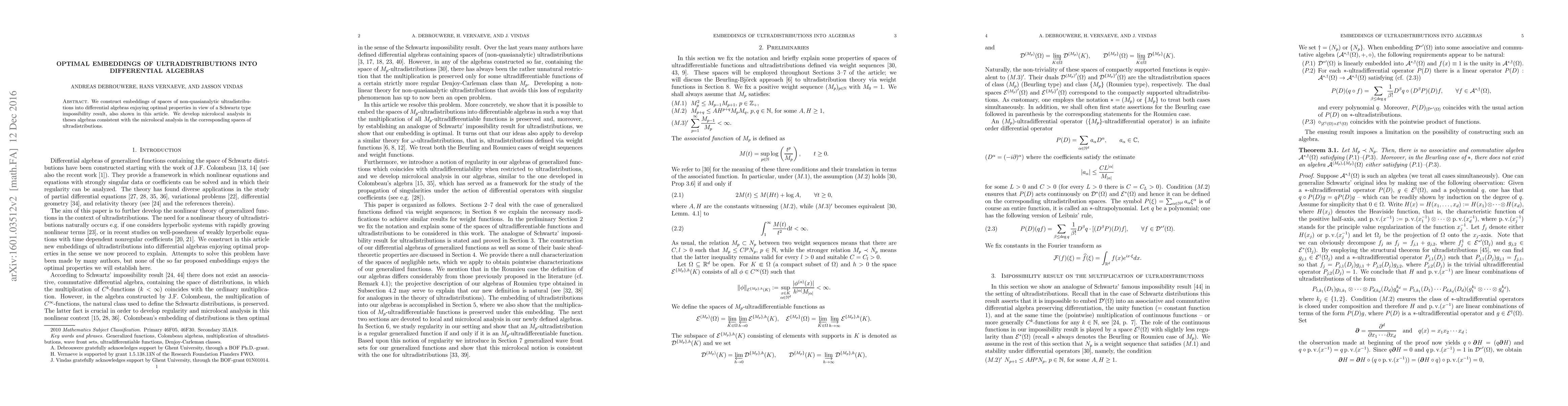 Summary: This paper constructs optimal embeddings of non-quasianalytic ultradistributions into differential algebras, addressing a Schwartz-type impossibility result. It also develops microlocal analysis in these algebras that aligns with the microlocal analysis of ultradistributions.